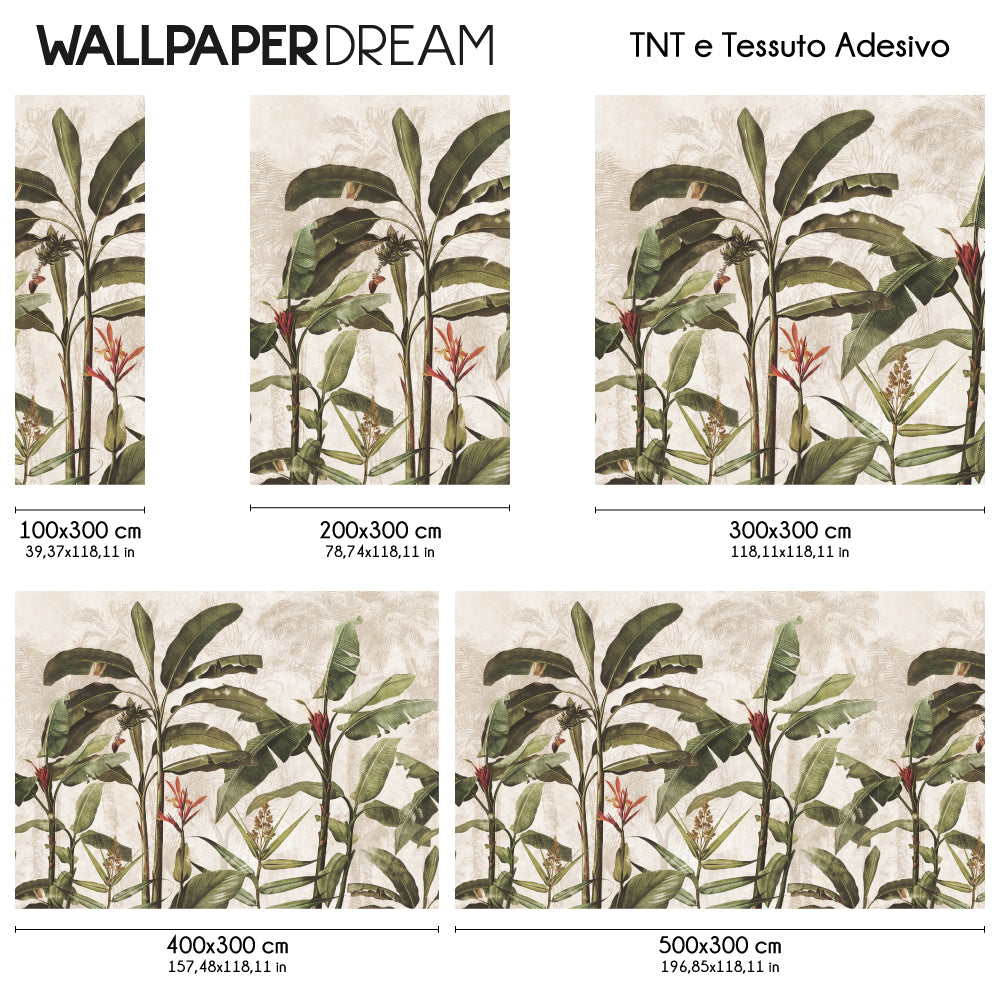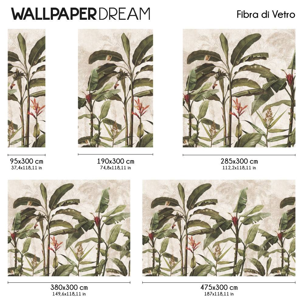 Der Eindruck eines äquatorialen Waldes findet sich in den blassen und sanften Tönen von Olivgrün und Beige, mit roten und gelben floralen Akzenten, zusammen mit dem beigen Hintergrund konkrete Wirkung mit tropischen Pflanzentönen in Grautönen schaffen eine einladende Wirkung für das ganze Haus.