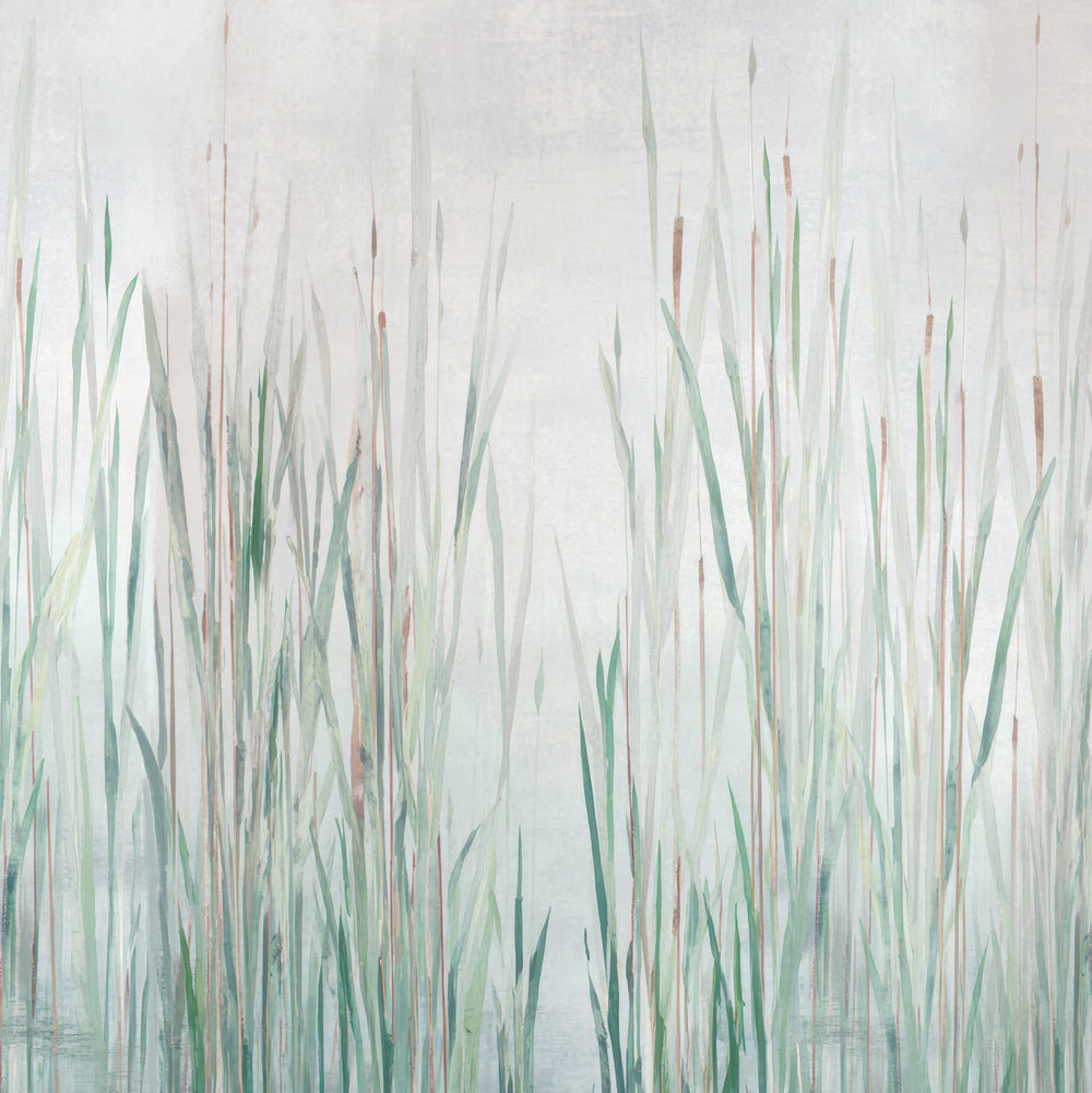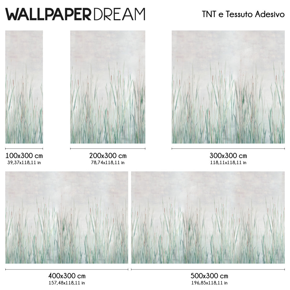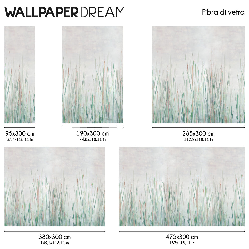 Questo design esclusivo apre una finestra su un paesaggio onirico e sospeso: sottili steli di erba palustre, tipica degli acquitrini, si allungano verso il cielo, magistralmente rappresentati in un raffinato stile pittorico. I fili d'erba sembrano danzare tra nuvole leggere e nebbioline primaverili, creando una scena di movimento delicato capace di ampliare visivamente gli spazi, donando profondità e respiro anche agli ambienti più piccoli.