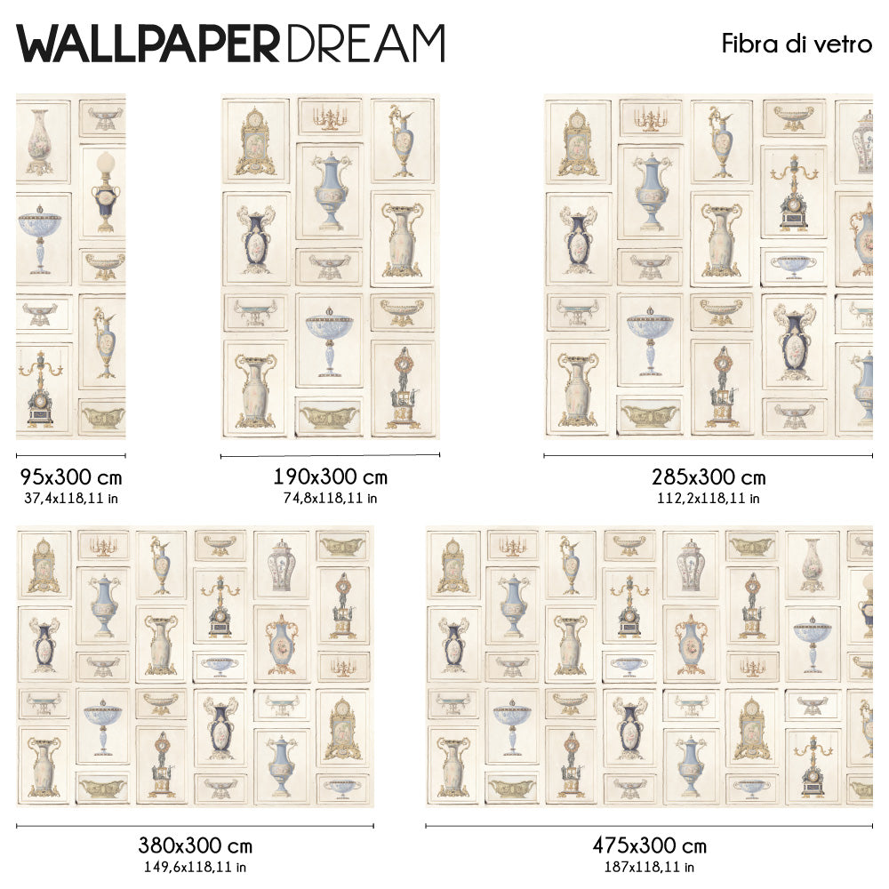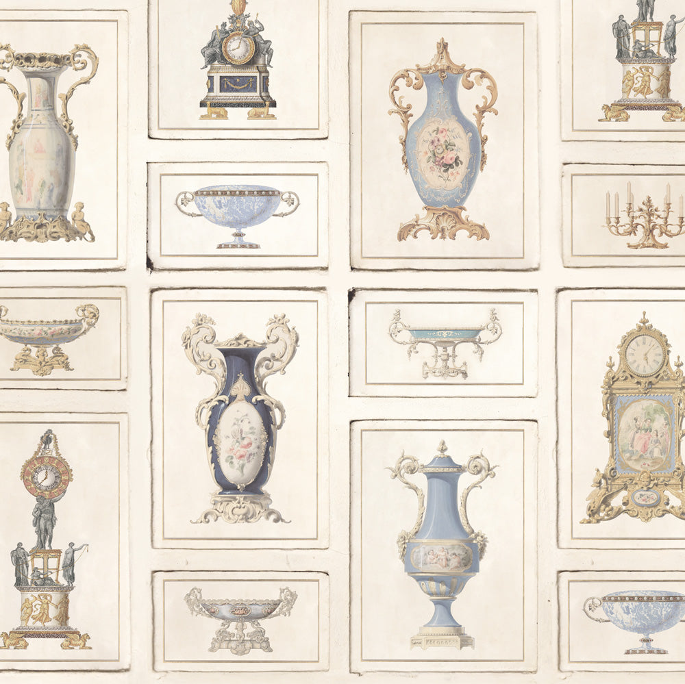 Il disegno raffigura una composizione raffinata di antichi vasi, orologi e candelabri di squisita fattura, resi con un dettagliatissimo effetto gouache. Questa tecnica conferisce al design una leggerezza pittorica unica.