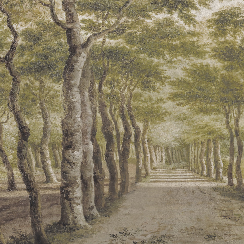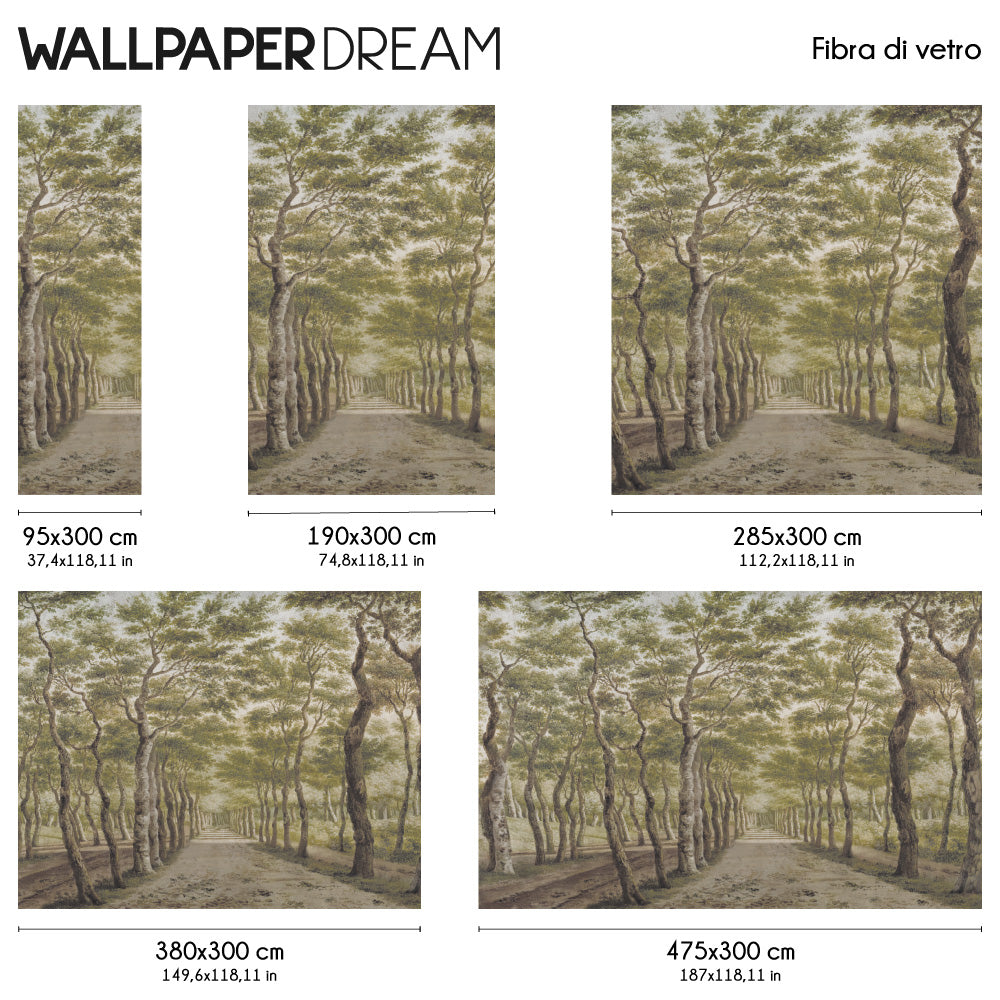 Das Design ruft den Zauber eines geheimen Gartens hervor, wo üppige Baumkronen und majestätische Bäume natürliche Kulissen von großer Eleganz schaffen. Dank eines feinen antiken Freskoeffekts gewinnt das Bild eine malerische Leichtigkeit, die wie ein Flüstern an den Wänden erscheint und historischen Charme mit der Klarheit zeitgenössischen Designs verbindet.