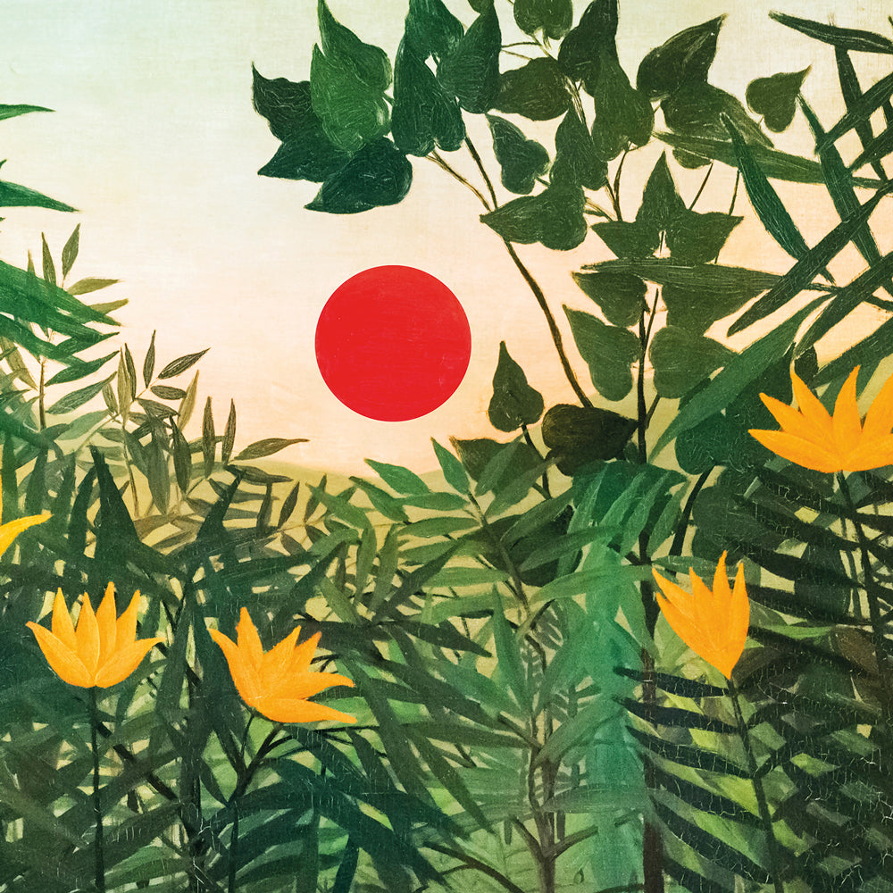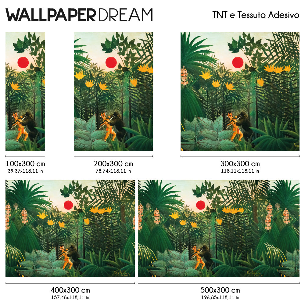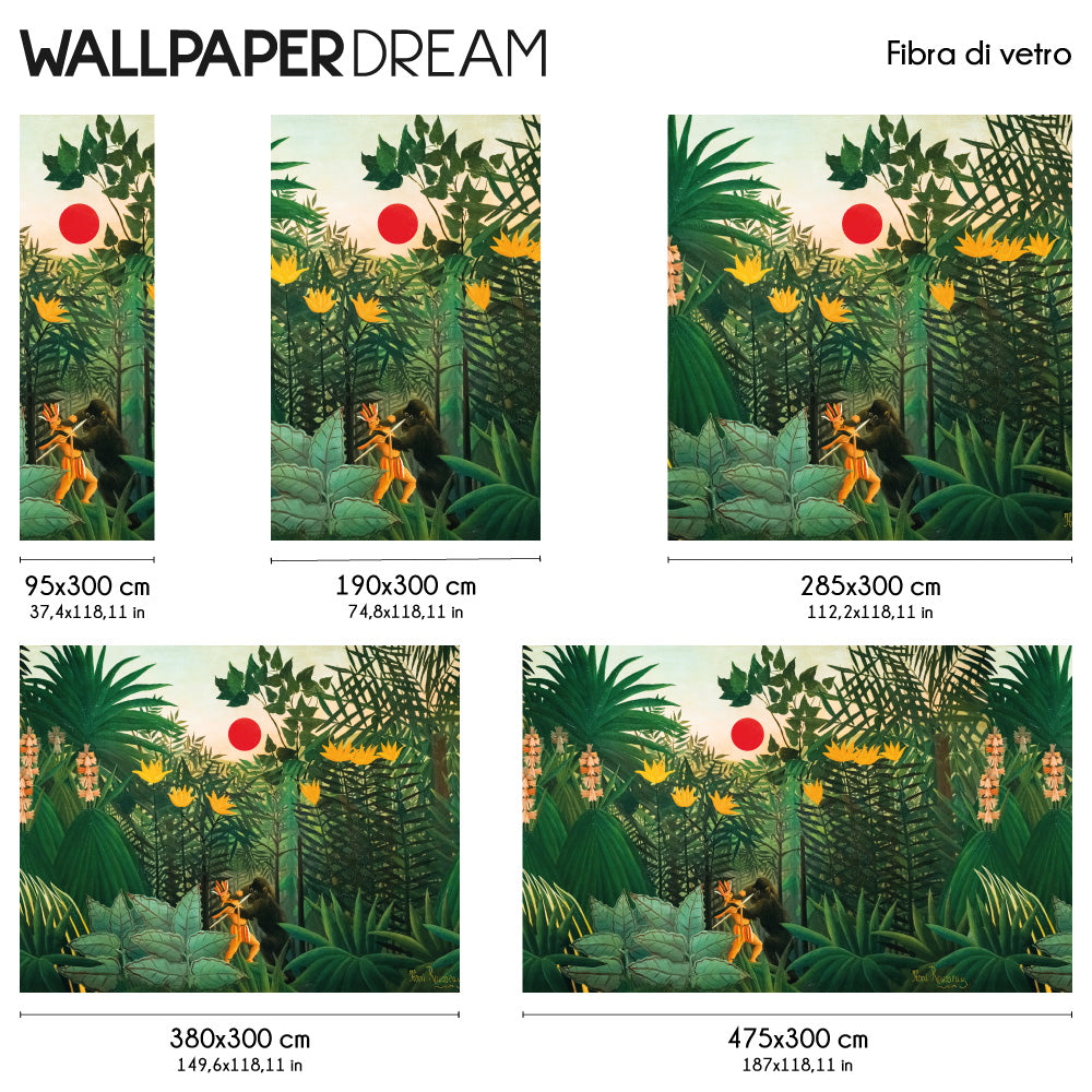 Betreten Sie die Welt von Rousseau mit dem fototapete "Exotische Landschaft". Beleuchten Sie Ihr Zuhause mit tropischen Farben und einer naiven Malerei! Lassen Sie die Dschungeltexturen die Sonne Feuerrot, Es ist gelbe Blumen entführen Sie in den epischen Kampf zwischen einem tapferen Eingeborenen, der einen Speer benutzt, und einem Gorilla. Ein einzigartiges Erlebnis, das Sie jeden Tag aufs Neue begeistern wird.