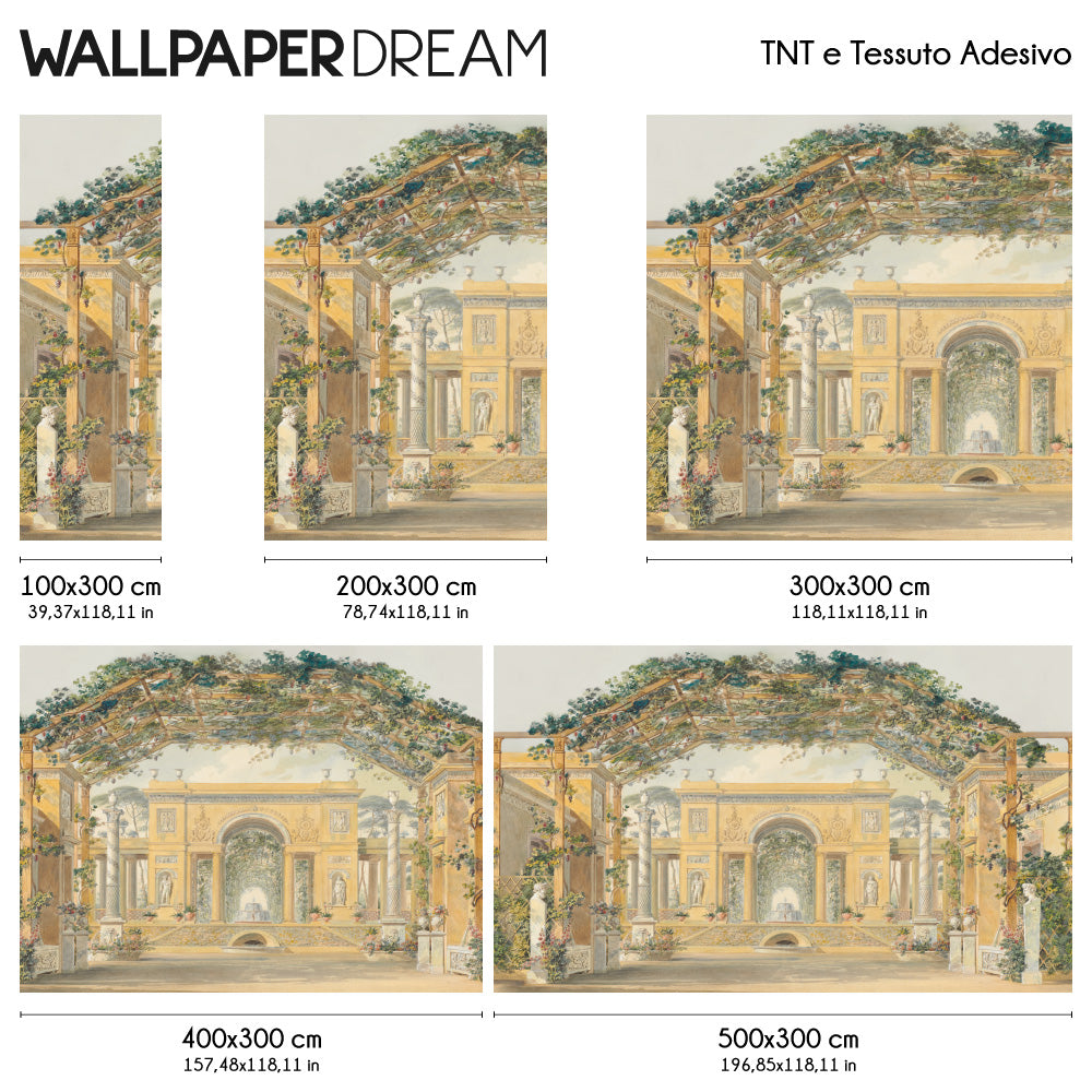 Die Szene, bis ins kleinste Detail ausgearbeitet, zeigt fein gearbeitete Kapitelle und antike Bauwerke, die im Hintergrund verblassen und eine außergewöhnliche räumliche Tiefe schaffen. Dank des zarten Aquarellstrichs und der leinenartigen Struktur erhält die Wand eine ätherische malerische Leichtigkeit, die jeden Raum in eine private Kunstgalerie verwandelt.