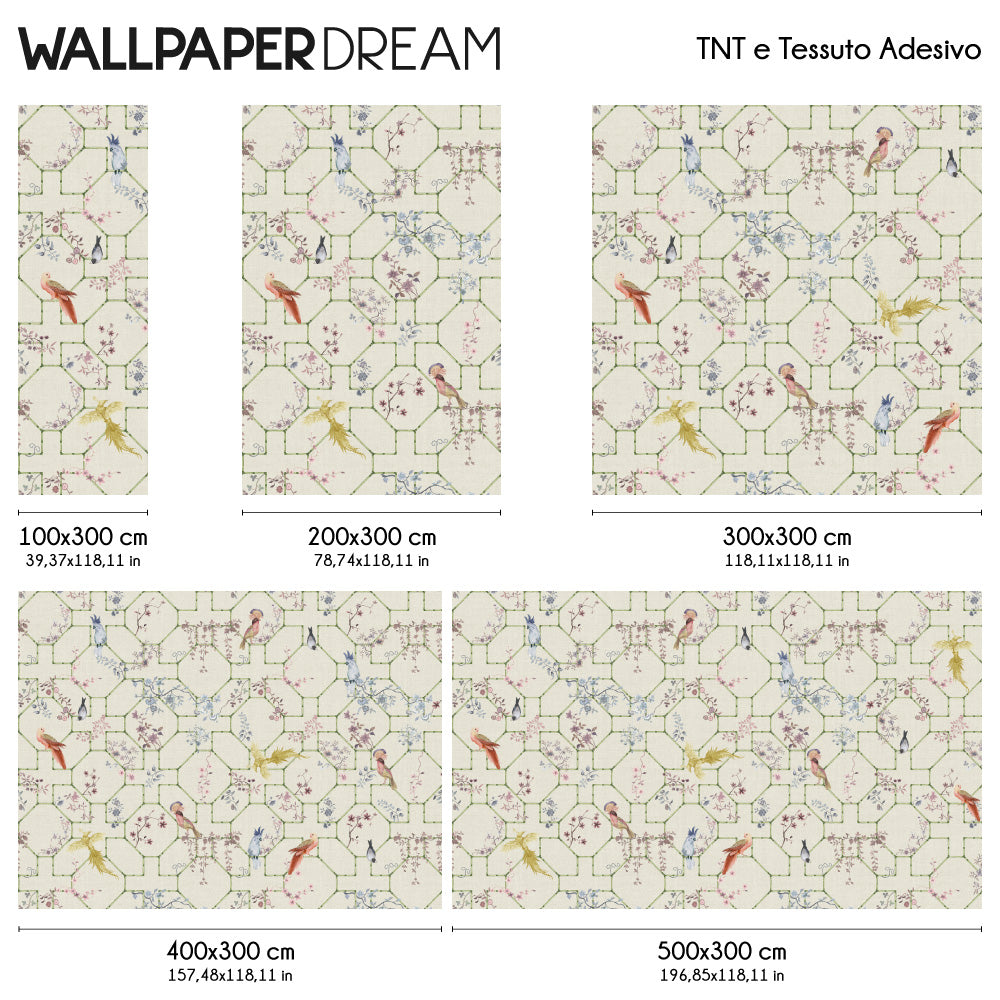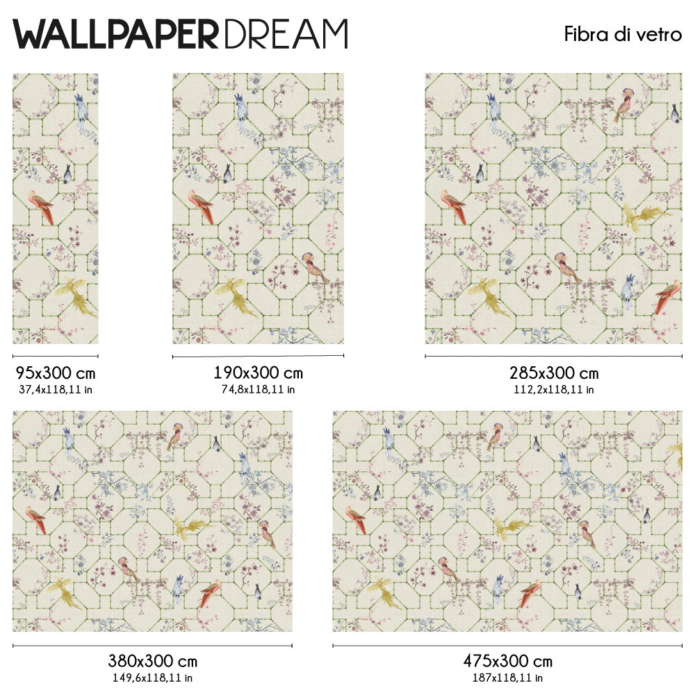 Die Carta da parati "Voliera" ist perfekt, um Ihre Schlafzimmer, Wohnzimmer und sogar Badezimmer zu bereichern, wo sie einen Hauch von Sanftheit und Eleganz bringen wird.