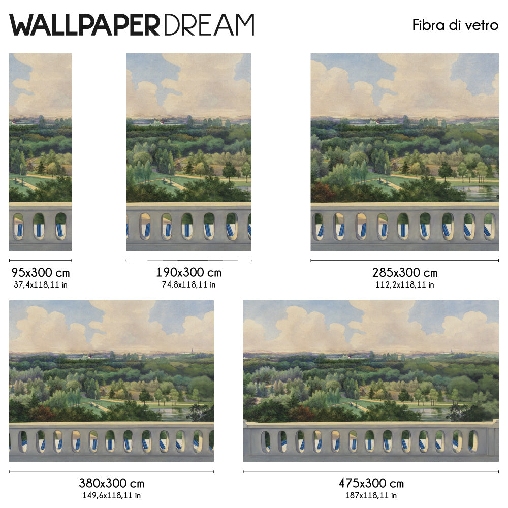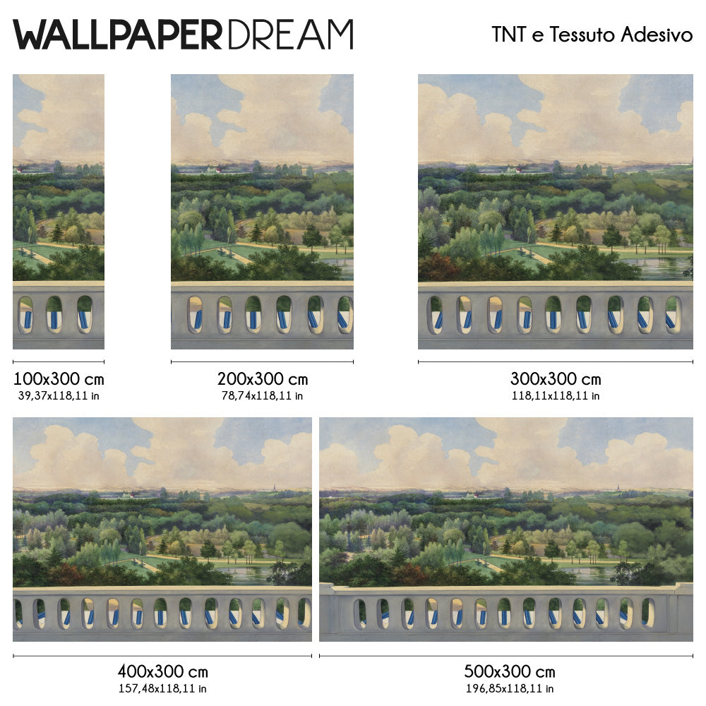 The vintage Wall Mural "Balconata antica" will make you daydream about endless landscapes through arched windows and ancient architectures. Corinthian capitals and busts frame the views of a wonderful rural eden, rich in vegetation and trees. The contrast between the white of the architectures and the green of the natural elements will captivate your guests and create a magical atmosphere in any room.