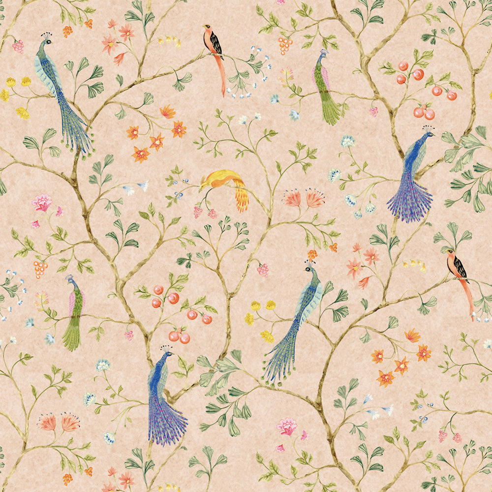 Lasciati avvolgere dal fascino senza tempo della nostra carta da parati "Chinoiserie con uccellini", un vero e proprio capolavoro decorativo che cattura l'essenza magica di una foresta esotica, interpretata attraverso il più raffinato stile orientale Chinoiserie.