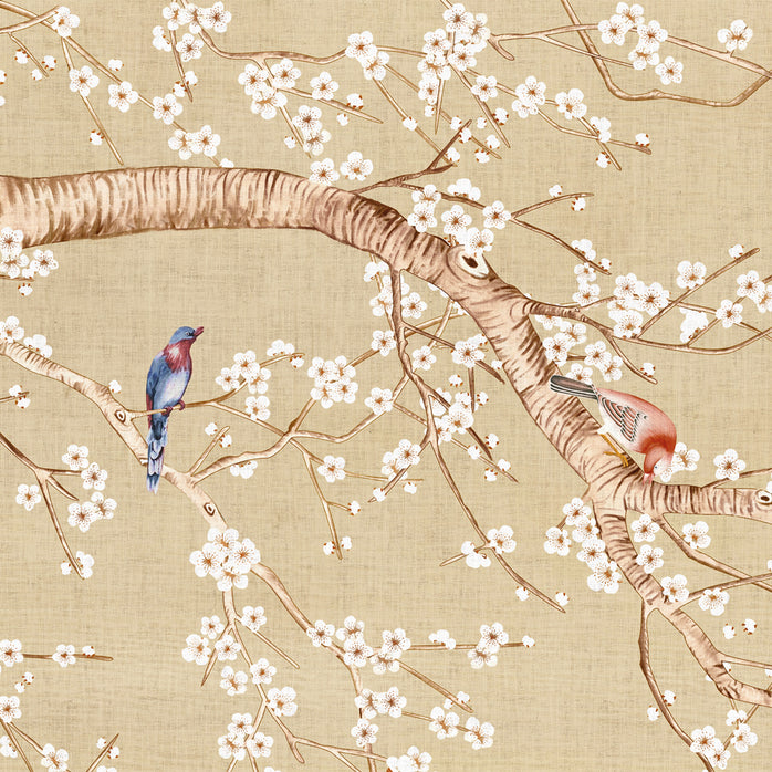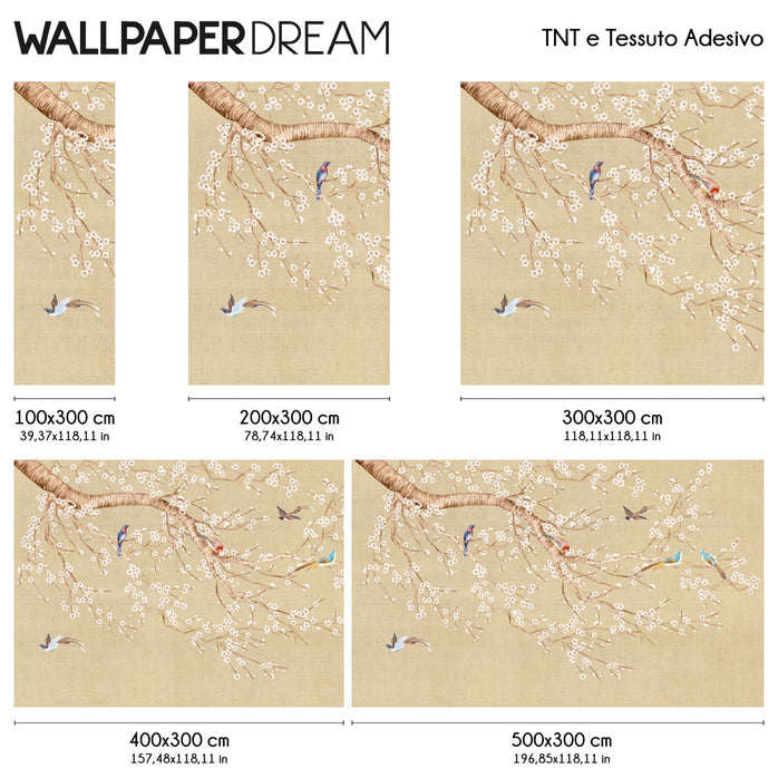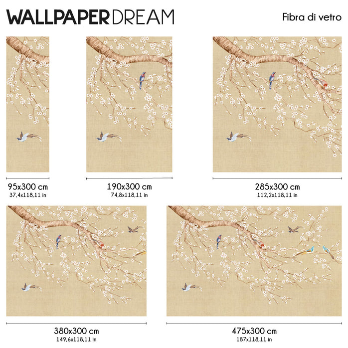 Lo scenario di "Fiori di Neve" si svela attraverso un'iconografia lussureggiante: uccellini variopinti dal piumaggio vibrante si posano con estrema grazia su rami di ciliegio in fiore. Ogni dettaglio botanico è intrecciato su un prezioso fondo beige anticato, una tonalità calda e materica che dona profondità e una texture "vissuta" all'ambiente, evocando il prestigio delle dimore storiche europee di fine Ottocento.