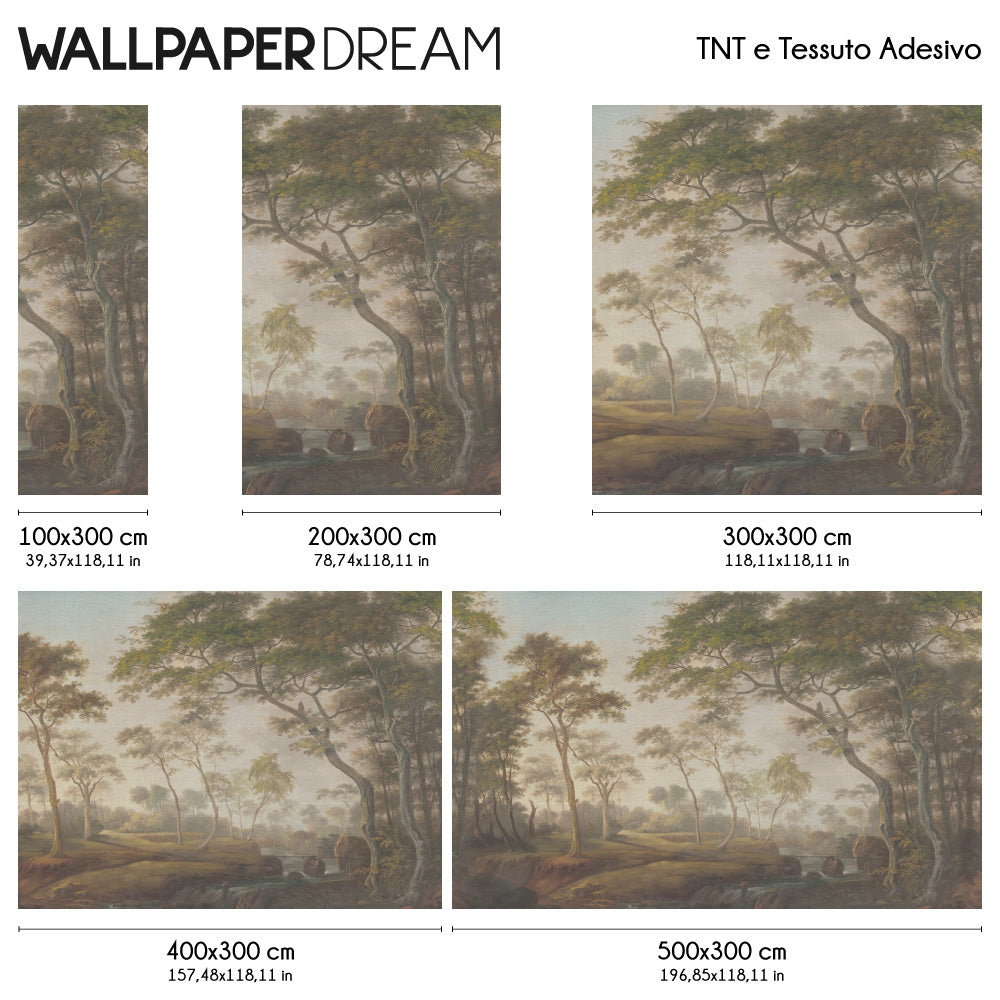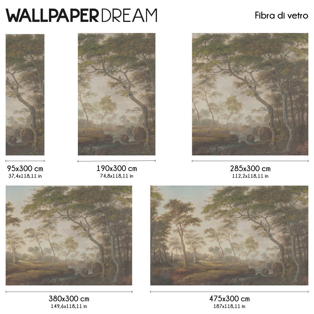 Questo motivo dal fascino retrò e dall'inconfondibile effetto acquerello ritrae un bosco lussureggiante e denso, ricco di alberi maestosi e una vegetazione rigogliosa.