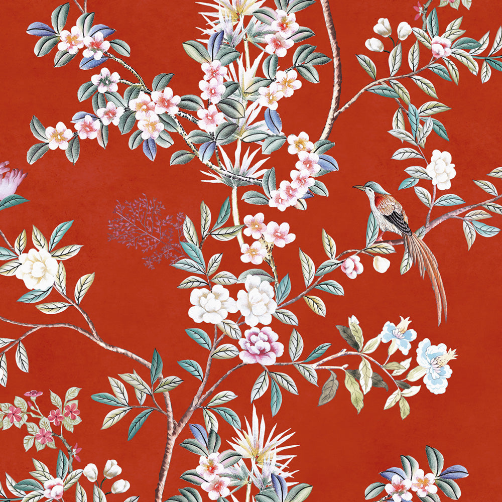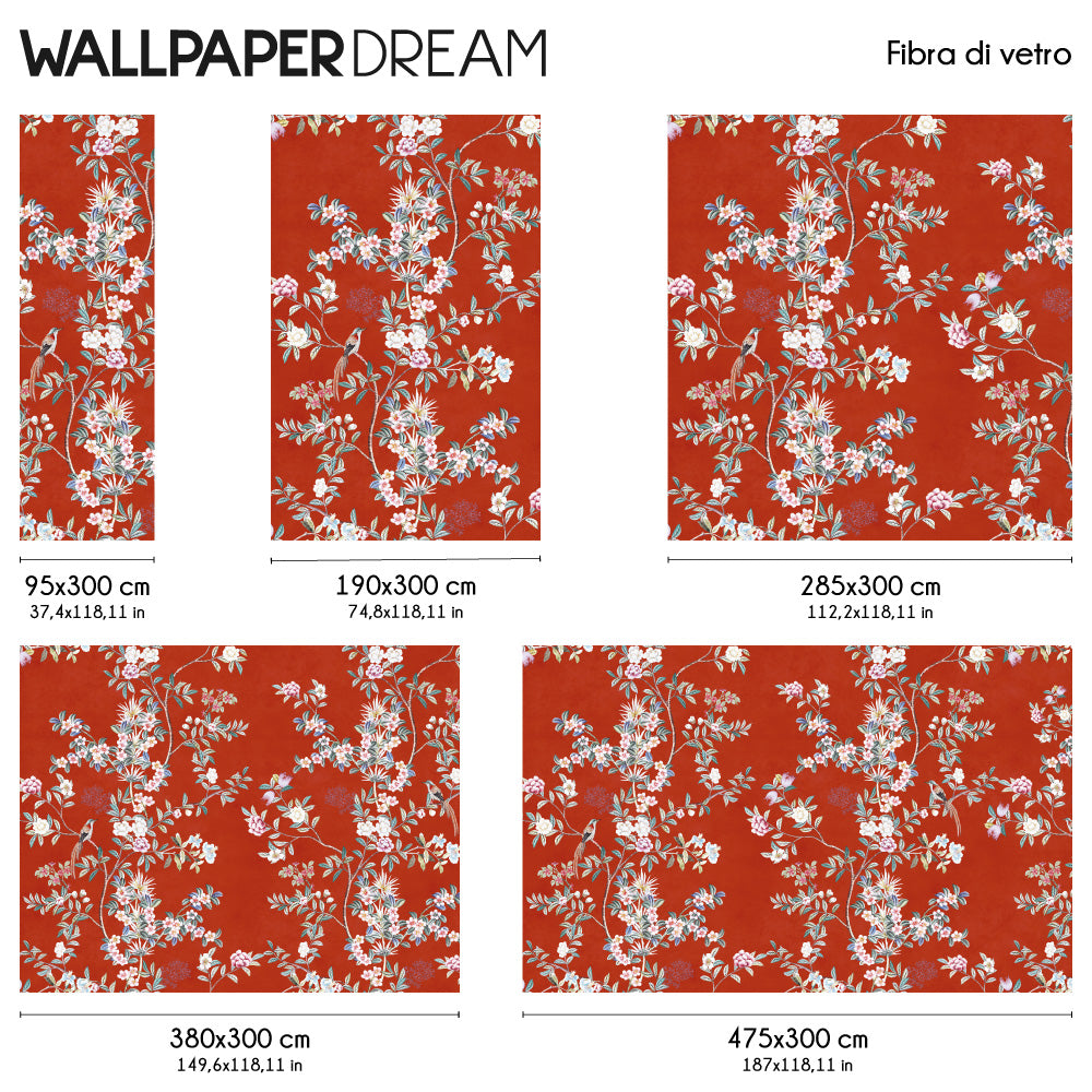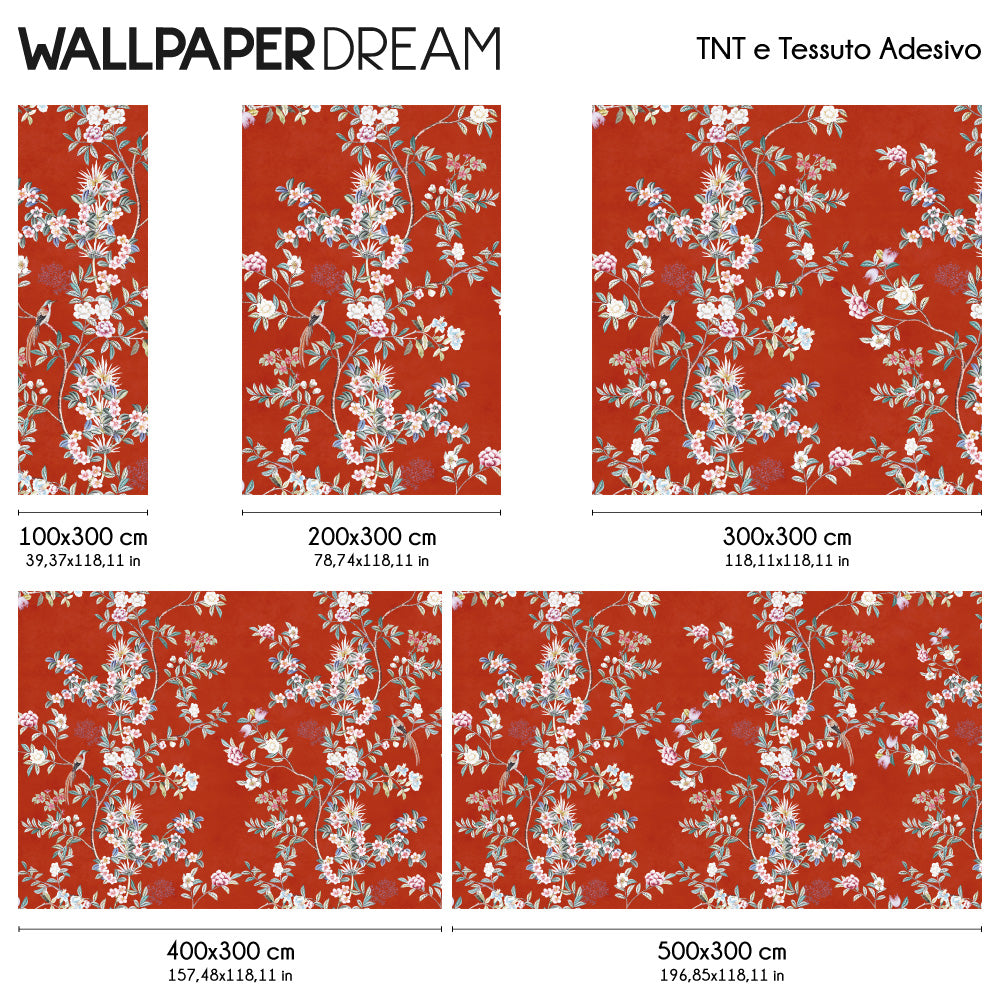 The Wall Mural 'Scarlet Chinoiserie' is an ode to the culture and artistic tradition of the East, an explosion of elegance and symbolism. Branches and flowers, drawn with a vintage and sophisticated touch, intertwine on a distressed background, creating an atmosphere rich in charm and mystery. Elegant little birds flutter among the leaves, bringing a touch of lightness and grace. The brick red background, a symbol of wealth and prosperity in the East, makes this Wall Mural unique and auspicious.