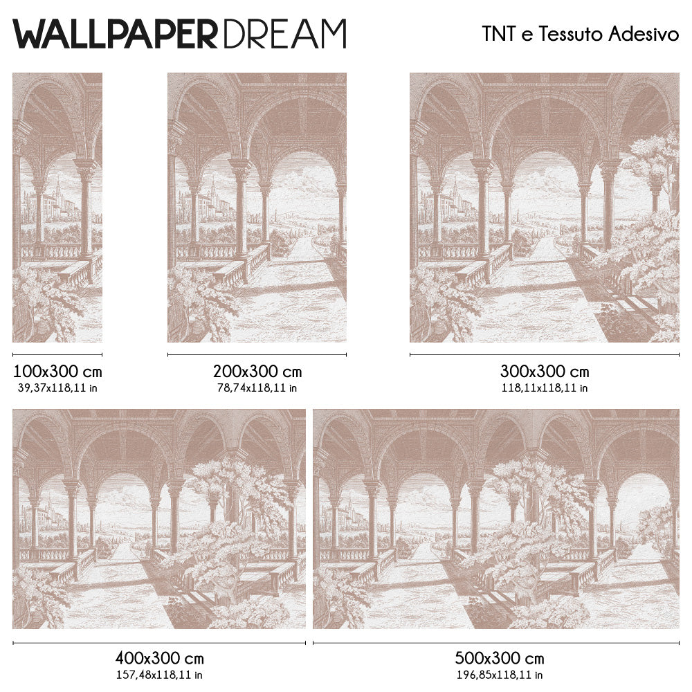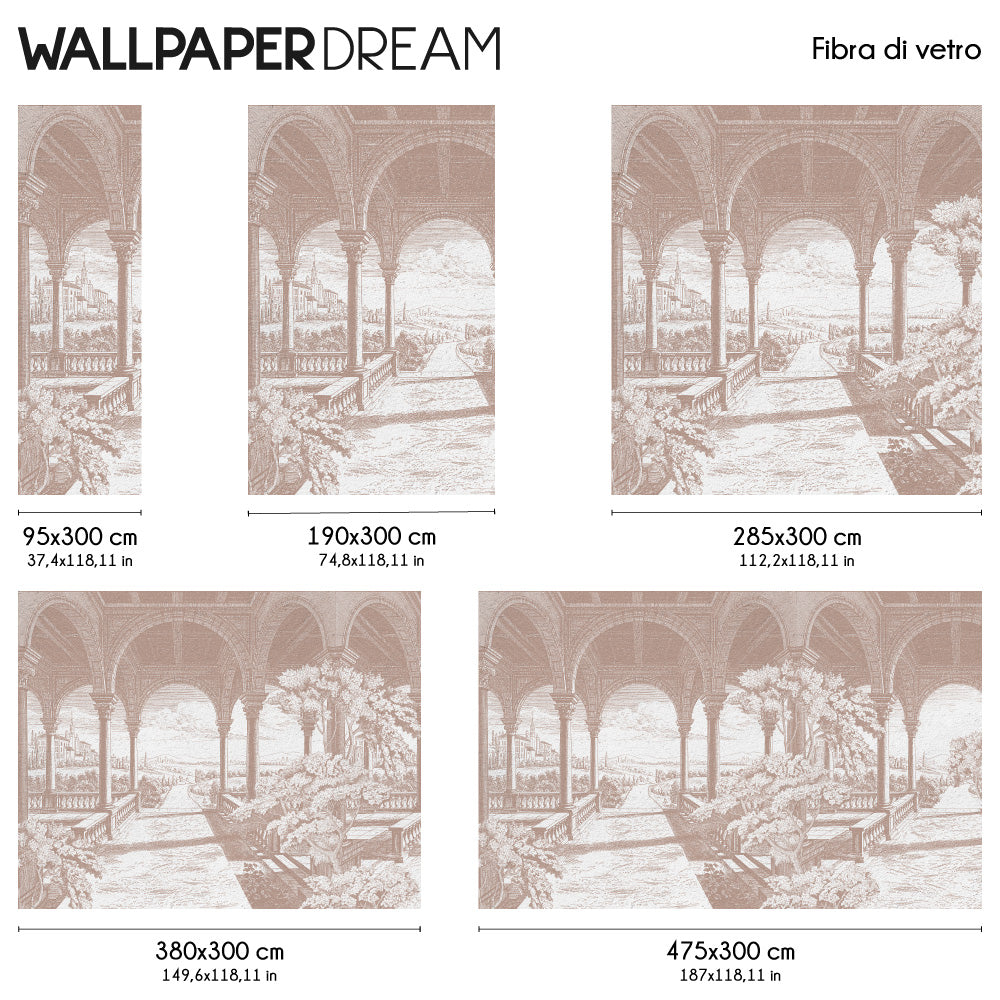 The vintage Wall Mural 'Loggia bucolica' will make you daydream about endless landscapes and ancient architectures. Arches and columns magically stretch before your eyes and open onto a countryside view. Trees and plants frame the elements, creating a perfect blend of artificial and natural. Available in the delicate trendy color Mocha Mousse.