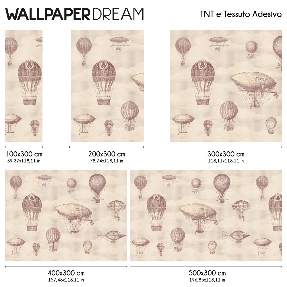 The vintage Wall Mural "The World Tour" will make you dream of distant lands with your eyes wide open. The balloons, executed in an engraving style, soar in the sky filled with soft clouds. The sepia color recalls the illustrations of a bygone era, evoking a sense of wonder and adventure. The hot air balloons evoke a sense of adventure and freedom, and the soft colors help create a nostalgic and evocative atmosphere.