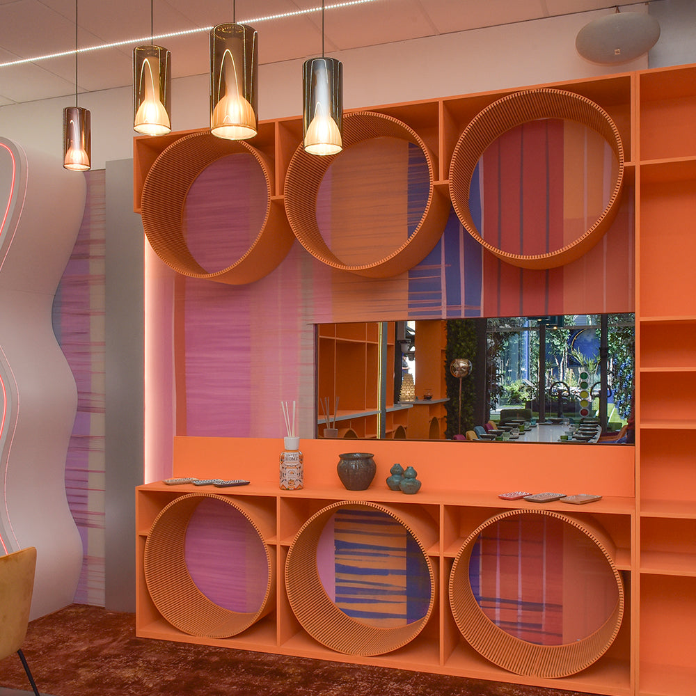 The " Abstract Ribbons " Wall Mural will captivate you with the joy of its colours. The warm tones, from pinks to orange yellows with touches of indigo, are ideal for covering all rooms with a modern character.