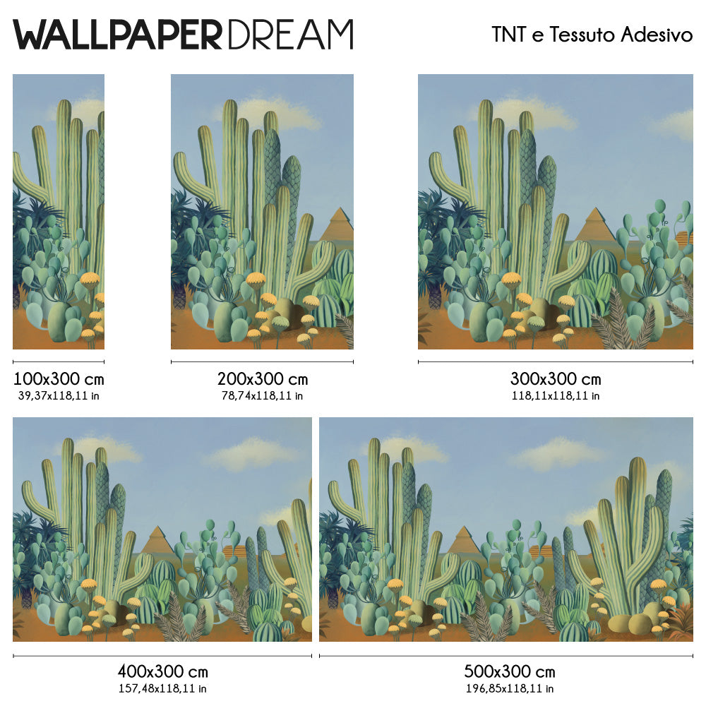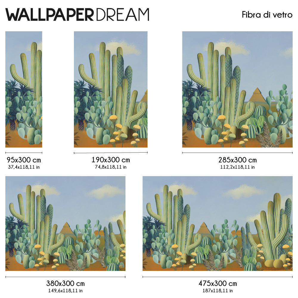 Live a unique furnishing experience with the " Cactus and pyramids " Wall Mural , exclusive WallpaperDream . The pastel colors and surreal and imaginative shapes are a refined reference to the artistic movements of the early 20th century. The cacti and ancient buildings in the background will make your every environment a true work of art.
