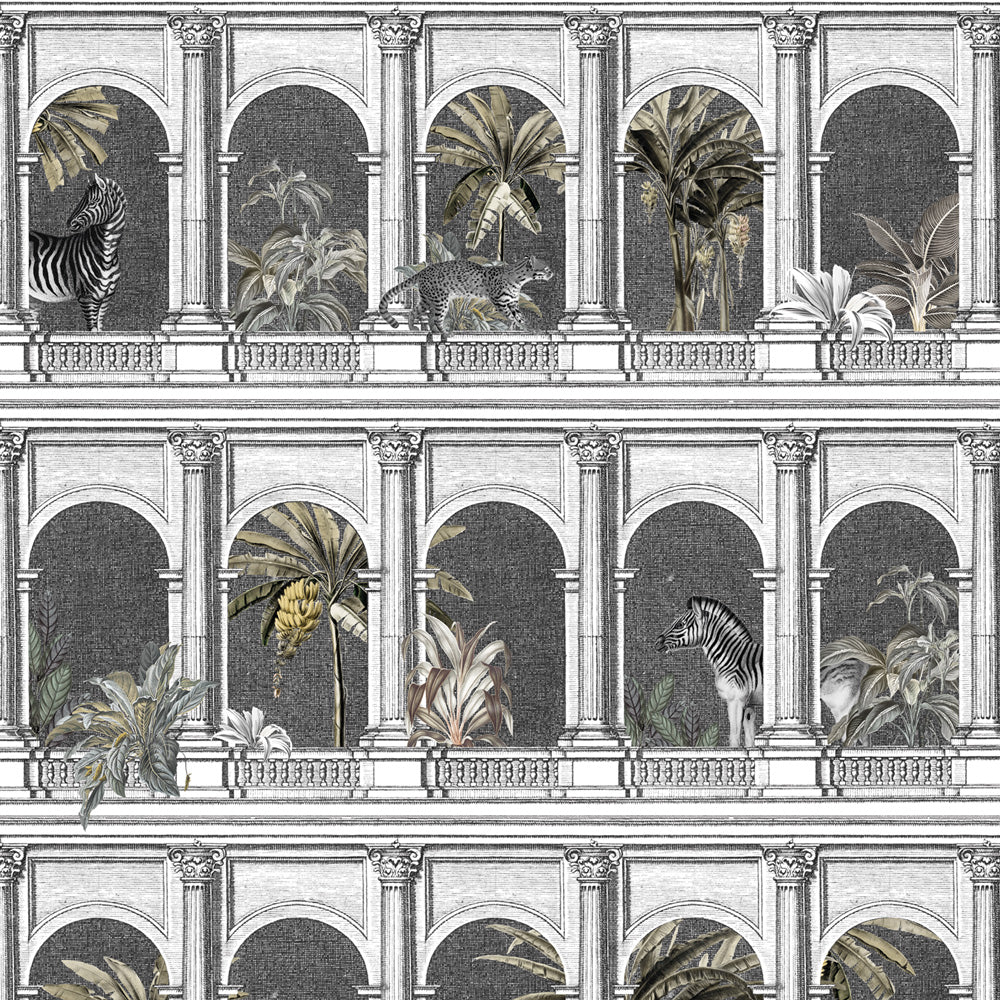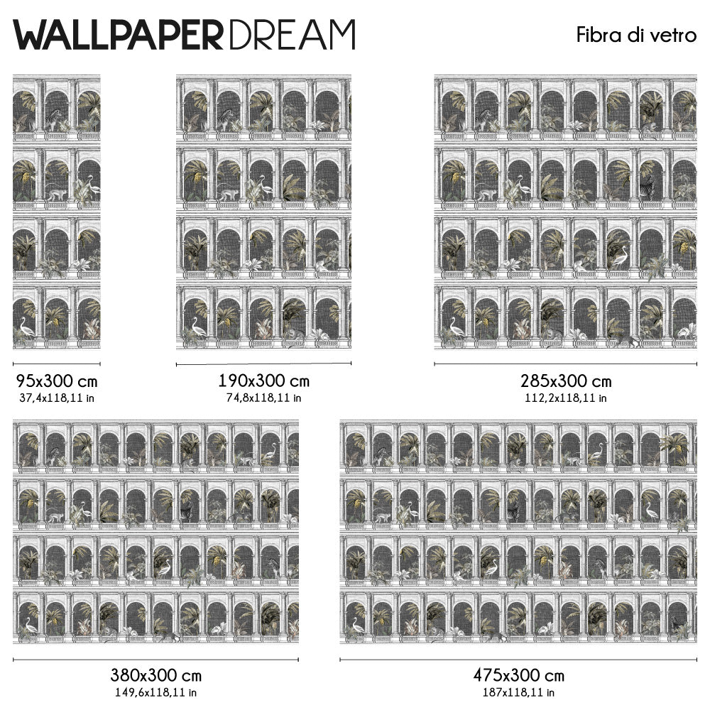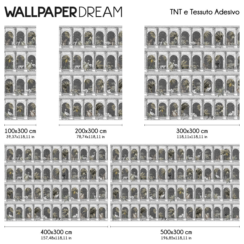 The Wall Mural with a vintage flavor "Tropical Arches" depicts in an exquisite engraving effect, animals and tropical plants framed by imaginative architectures. The arches follow in orderly rows, expanding the spaces of your home with refinement and elegance.