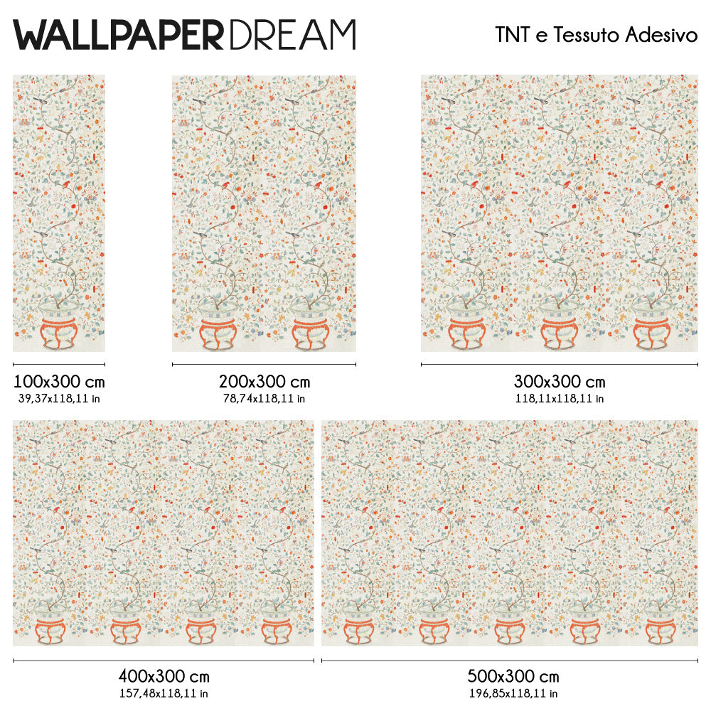 The Wall Mural 'Intrecci' is an ode to Eastern culture and artistic tradition, an explosion of elegance and symbolism. Branches and flowers, emerging from refined vases drawn with a vintage and sophisticated touch, intertwine on a light antique beige background, creating an atmosphere full of charm and mystery. Elegant little birds flutter among the leaves, bringing a touch of lightness and grace. The light beige background, evoking delicacy and harmony, makes this Wall Mural unique and auspicious for any environment.