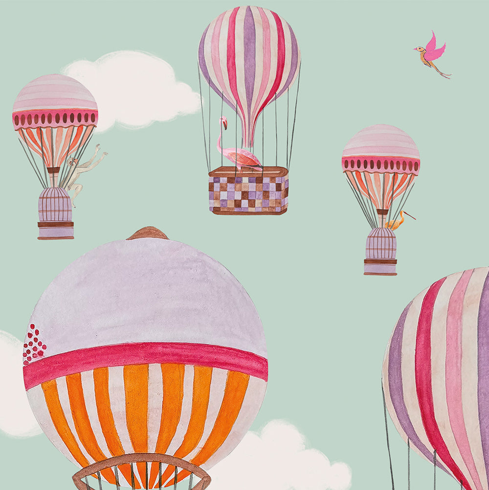 I Protagonisti del Cielo: Una flotta di mongolfiere ospita a bordo eleganti fenicotteri, curiose scimmie e maestosi ibis. Ogni animale è ritratto con un tratto che unisce il realismo della natura alla magia dell'illustrazione d'autore.