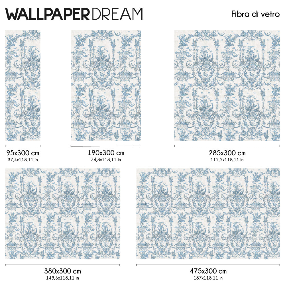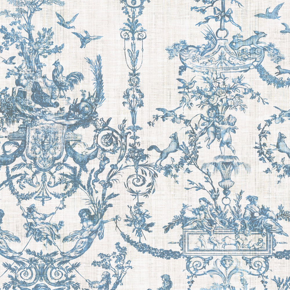 La carta da parati retrò "Toile preziosa" si ispira alla decorazione inglese di fine 800 con numerose scene bucoliche e grottesche. Il delicato colore celeste polvere e la texture effetto stoffa impreziosiscono questa grafica originale e raffinata. Gli alberi, gli animali, le persone e gli elementi architettonici prendono vita in un elegante stile incisione.