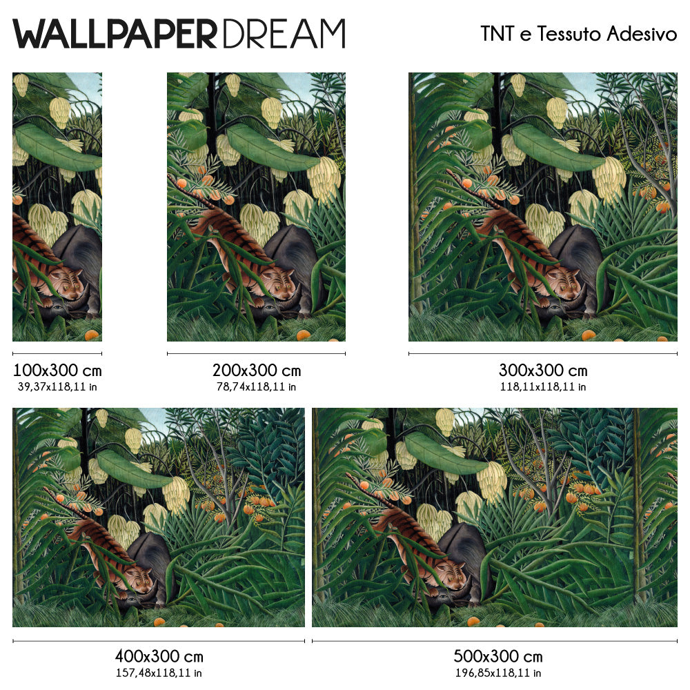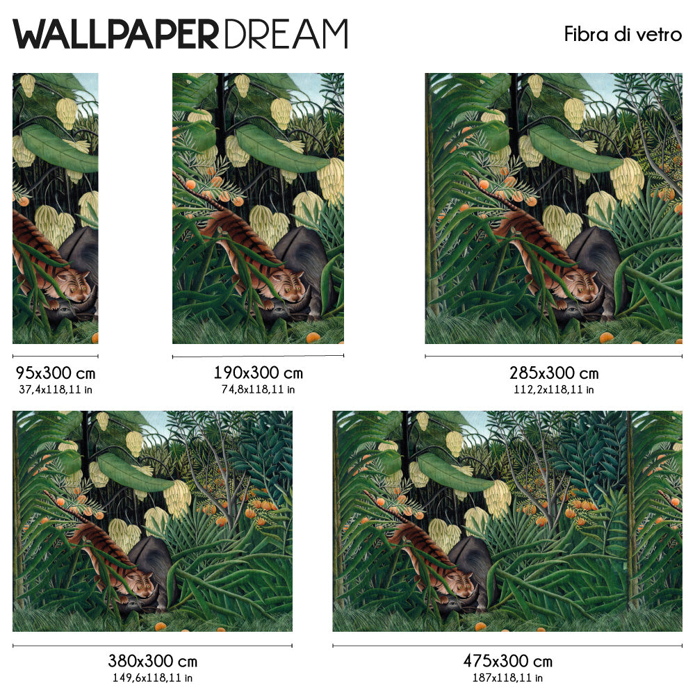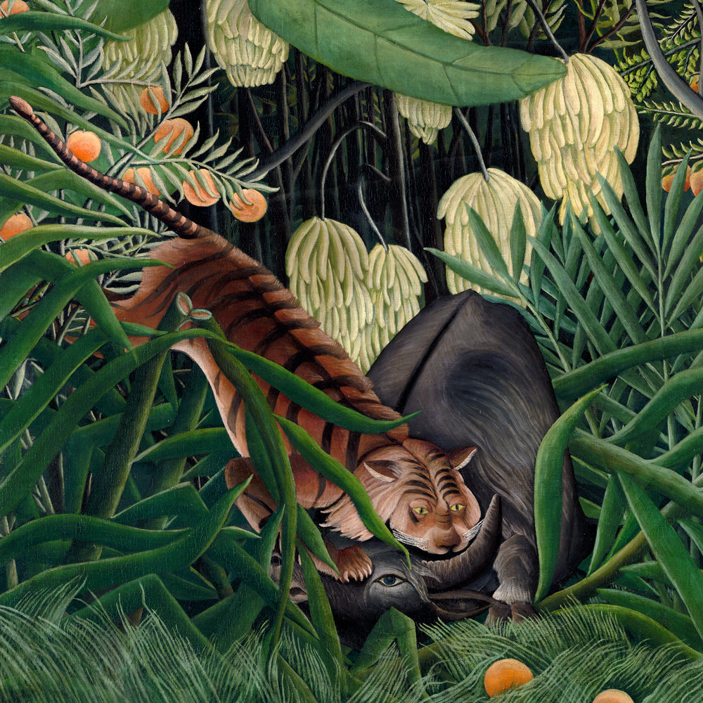 In the evocative artistic style of Rousseau, this Wall Mural represents a time of extraordinary competition in wild life. A majestic tiger stands among the lush vegetation, while a wild wildebeest fights for survival. The tiger's intense gaze and the relentless energy of the fight are captured in every brushstroke.