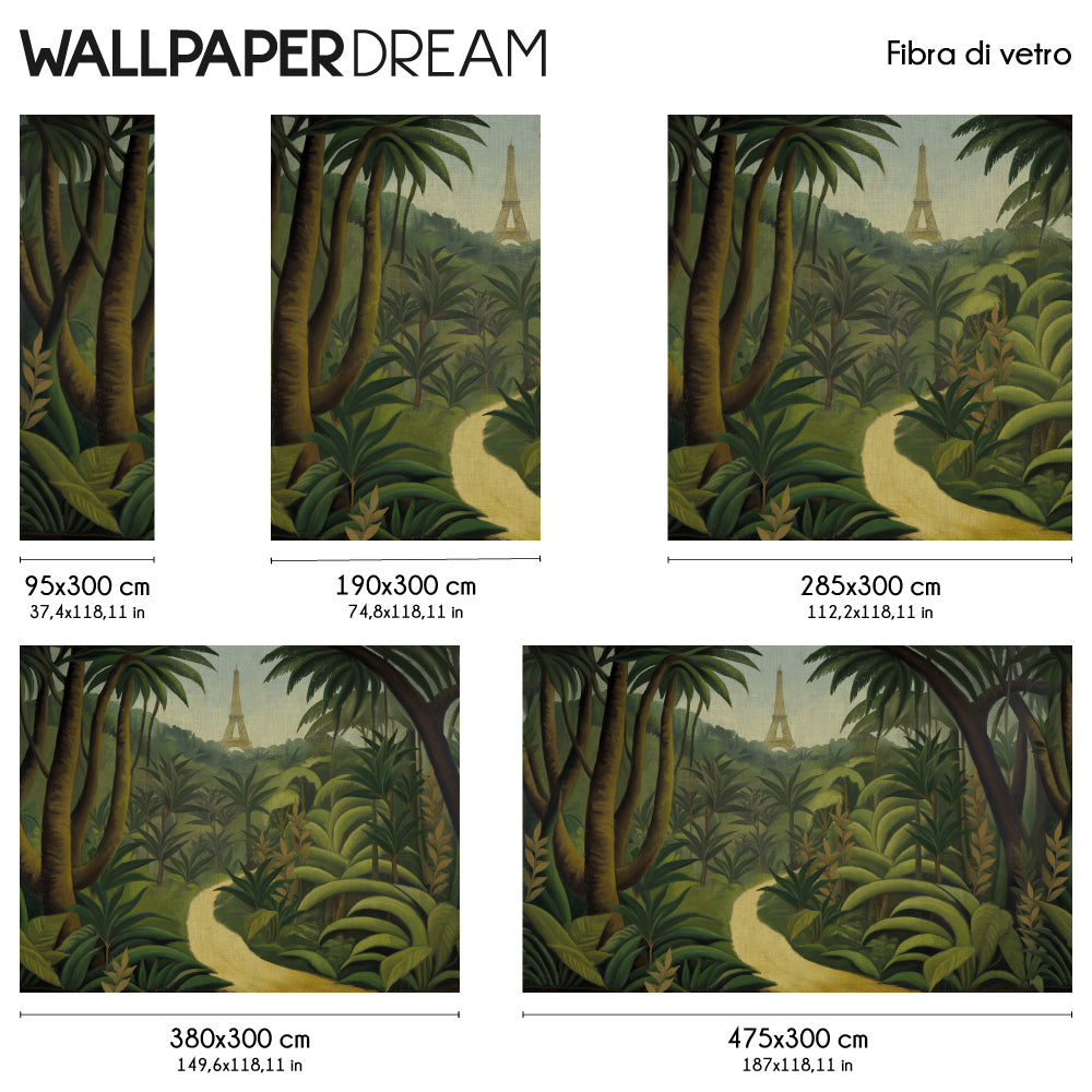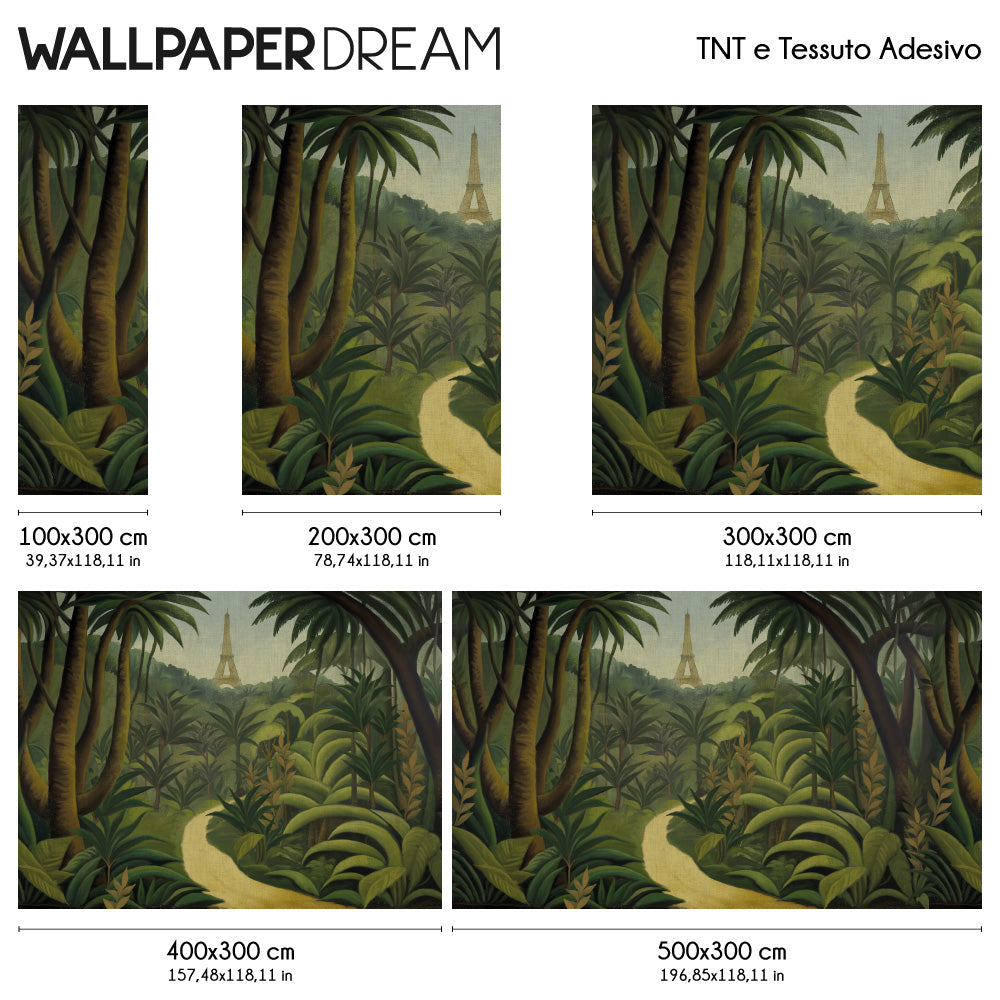 Let yourself be enchanted by the magic of the City of Light with our Wall Mural "Dreaming of Paris". The lush naive-style tropical plants of Rousseau meet the iconic Eiffel Tower in a surreal and original combination. Leaves and trees will intertwine on your walls with their thousand shades of green, while the symbol of Paris stands proudly in the background, adding surrealism to the design.
