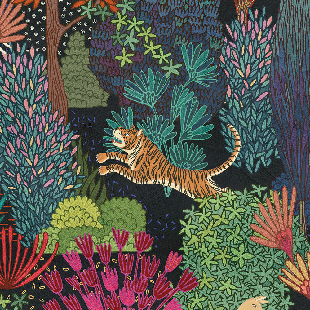 The tropical Wall Mural "Forest of Colors", exclusive to WallpaperDream, is an explosion of vitality and color. Palm trees and exotic plants, painted in a vibrant naif style, come to life against an anthracite background that adds a touch of mystery and magic. Among the branches of the trees peek exotic animals like tigers, antelopes, and leopards engaged in the struggle for survival. Choose a unique design to refresh your spaces, perfect for those who love art and nature.