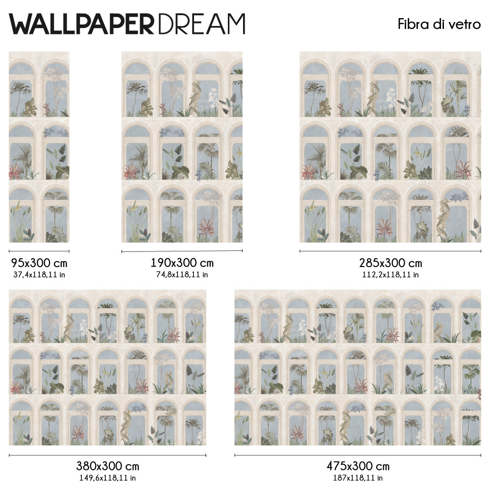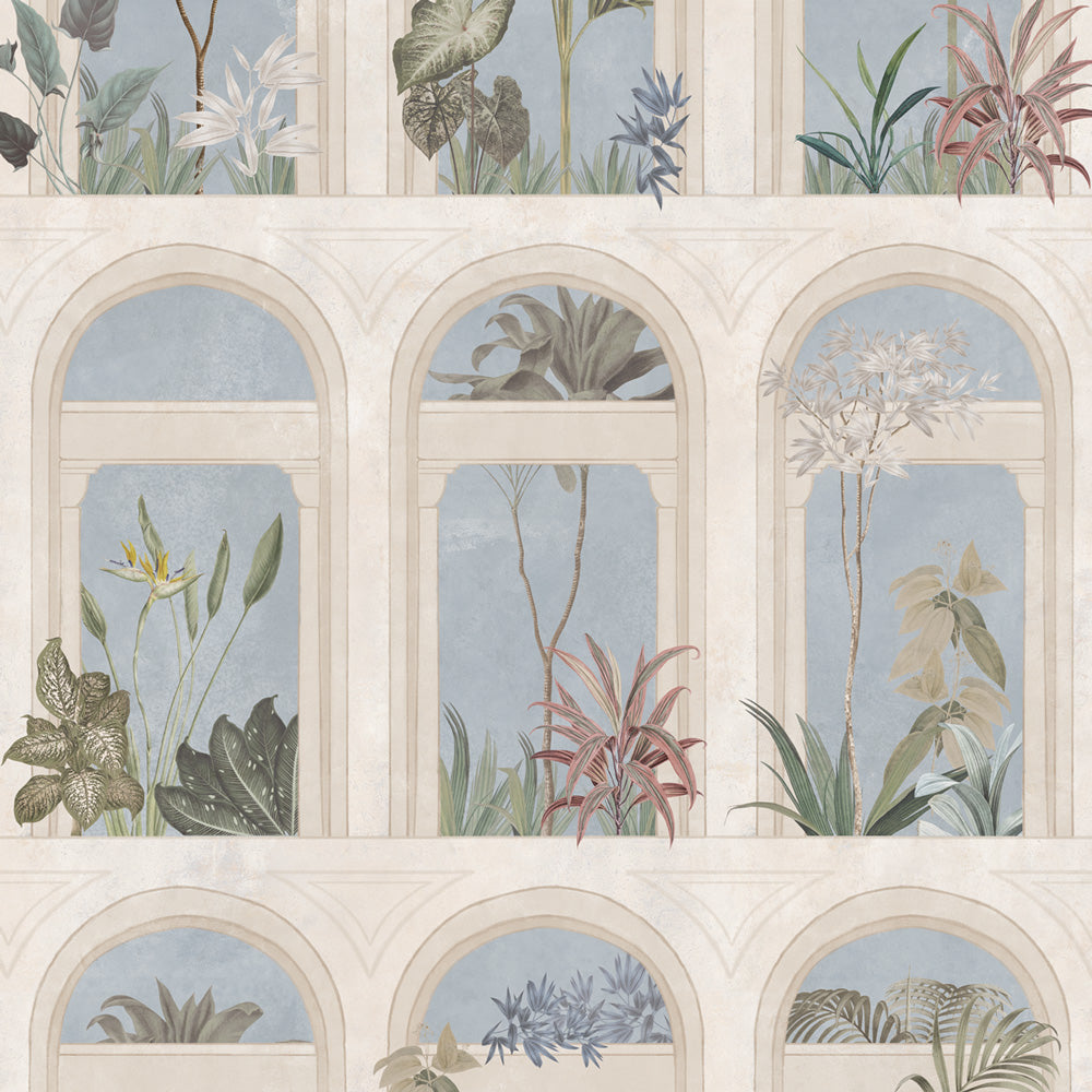 The Wall Mural "Loggia on Eden" is a hymn to architecture and nature with its succession of arches and exotic plants. The vintage-inspired depiction style and the soft colors used make it ideal for any decor, from the most classic to the modern. Available in two trendy colors: Sage Green and Sky Blue. Dress your walls in elegance with this original and unique work of art.
