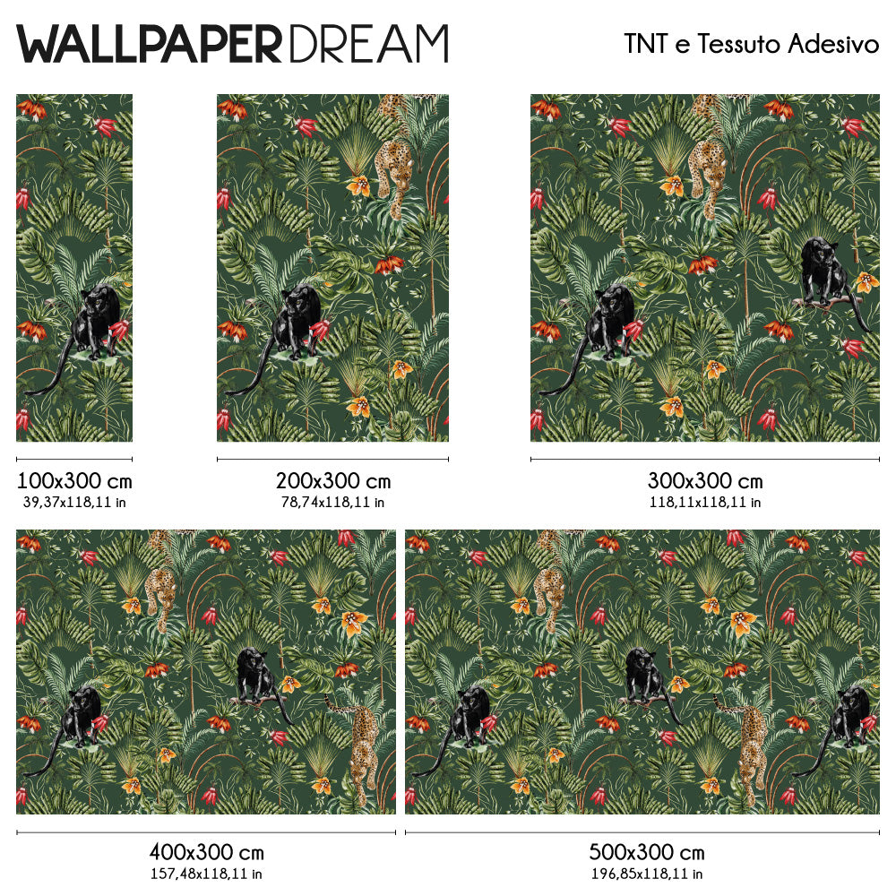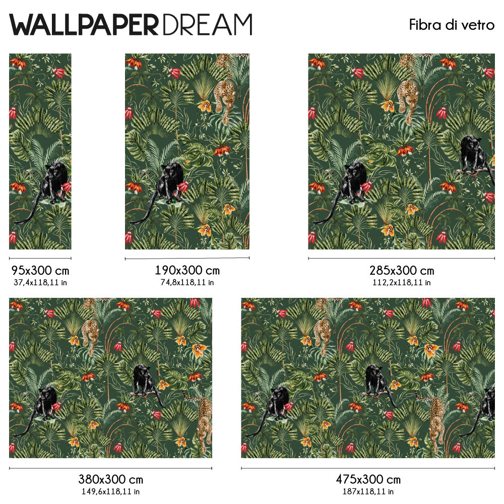 The tropical Wall Mural " Panthers in the Jungle " is inspired by the wall decorations of the past and reworked in a modern way. The vibrant colours, with a thousand shades of green and touches of red-orange and yellow, will make every room unique, from the bedrooms to the bathrooms and shower cubicles. Leopards and panthers, masterfully executed in watercolour, insinuate themselves among the leaves and tropical plants, among yellow and red flowers.