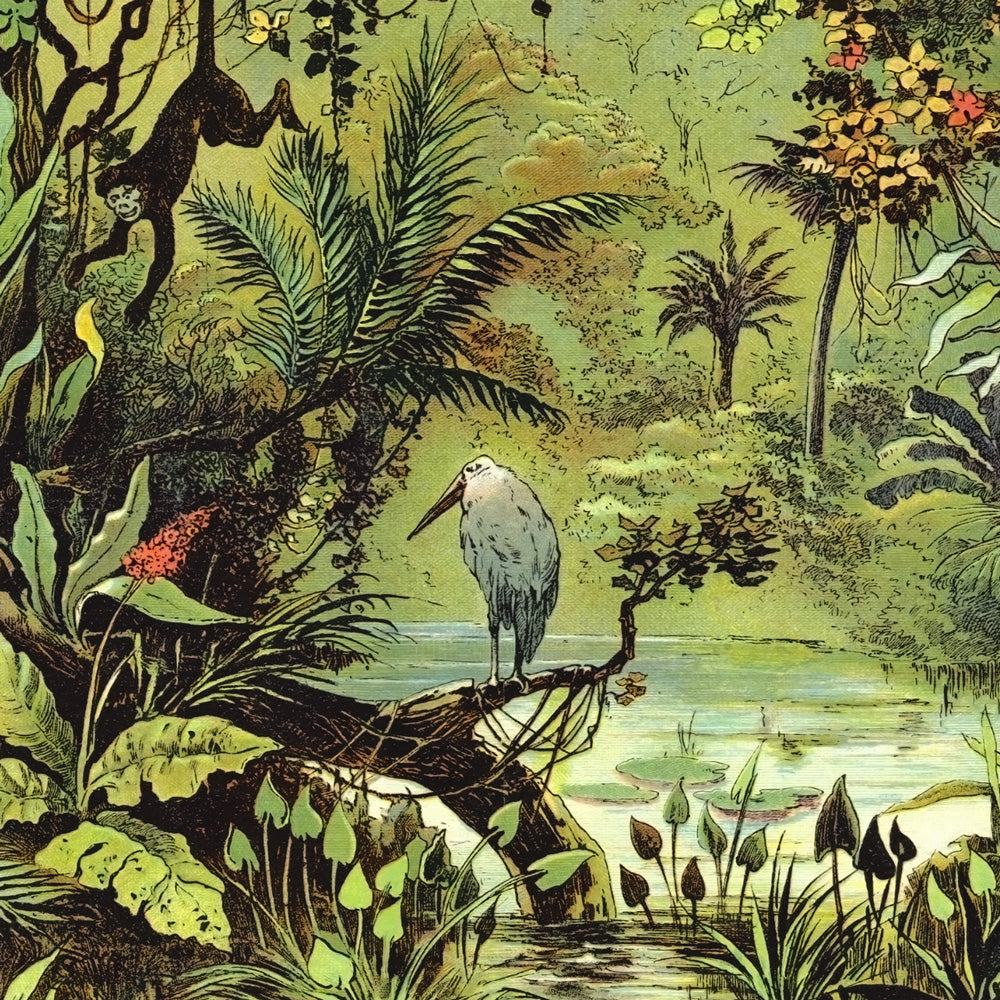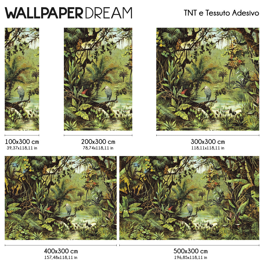 " Tropical art " is a Wall Mural with a vintage flavor in which palm trees and exotic plants, combined with tropical fauna, will bloom on your walls. The artistic ink technique makes this Wall Mural an authentic work of art, ideal for giving an original touch to rooms, from bathrooms to living rooms.