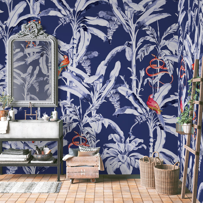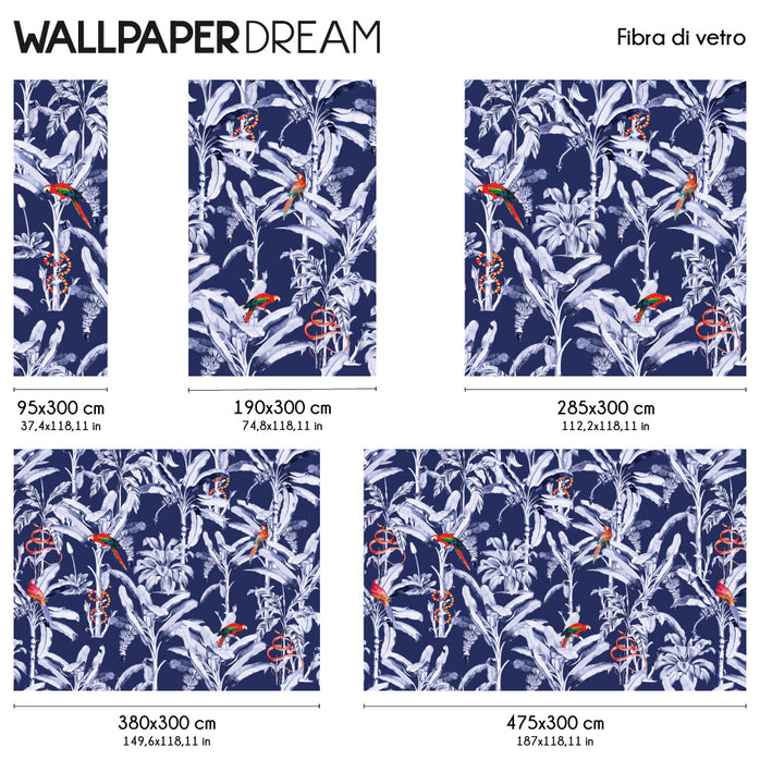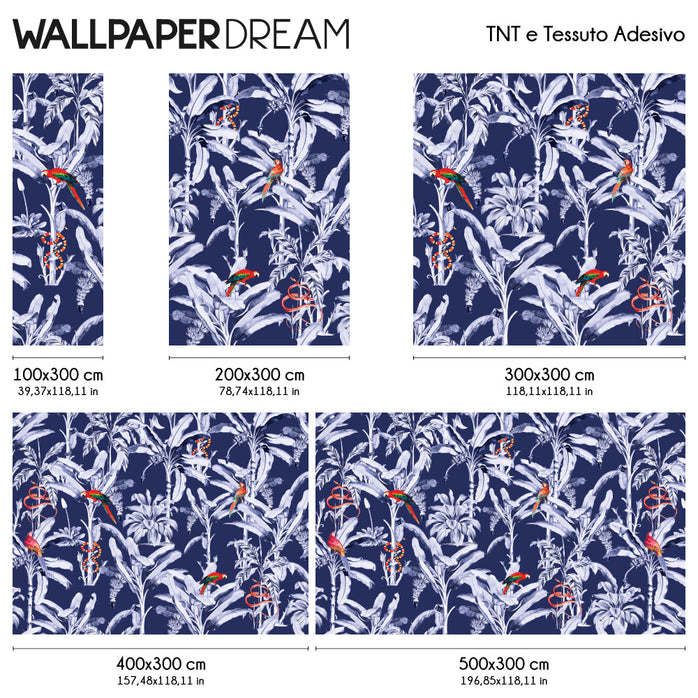 The Wall Mural "Jungle in Blue" will captivate you with its bright and trendy colors. The contrasting shades of bright reds and deep blue make this tropical-themed design unique and original, where colorful parrots and snakes peek out among the exotic palms. The vintage style perfectly blends with the modernity of the colors, making it suitable for any environment where you want to add a touch of personality.