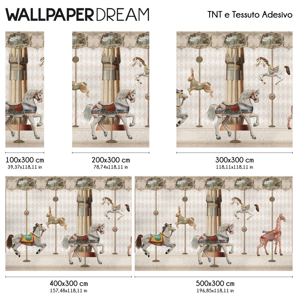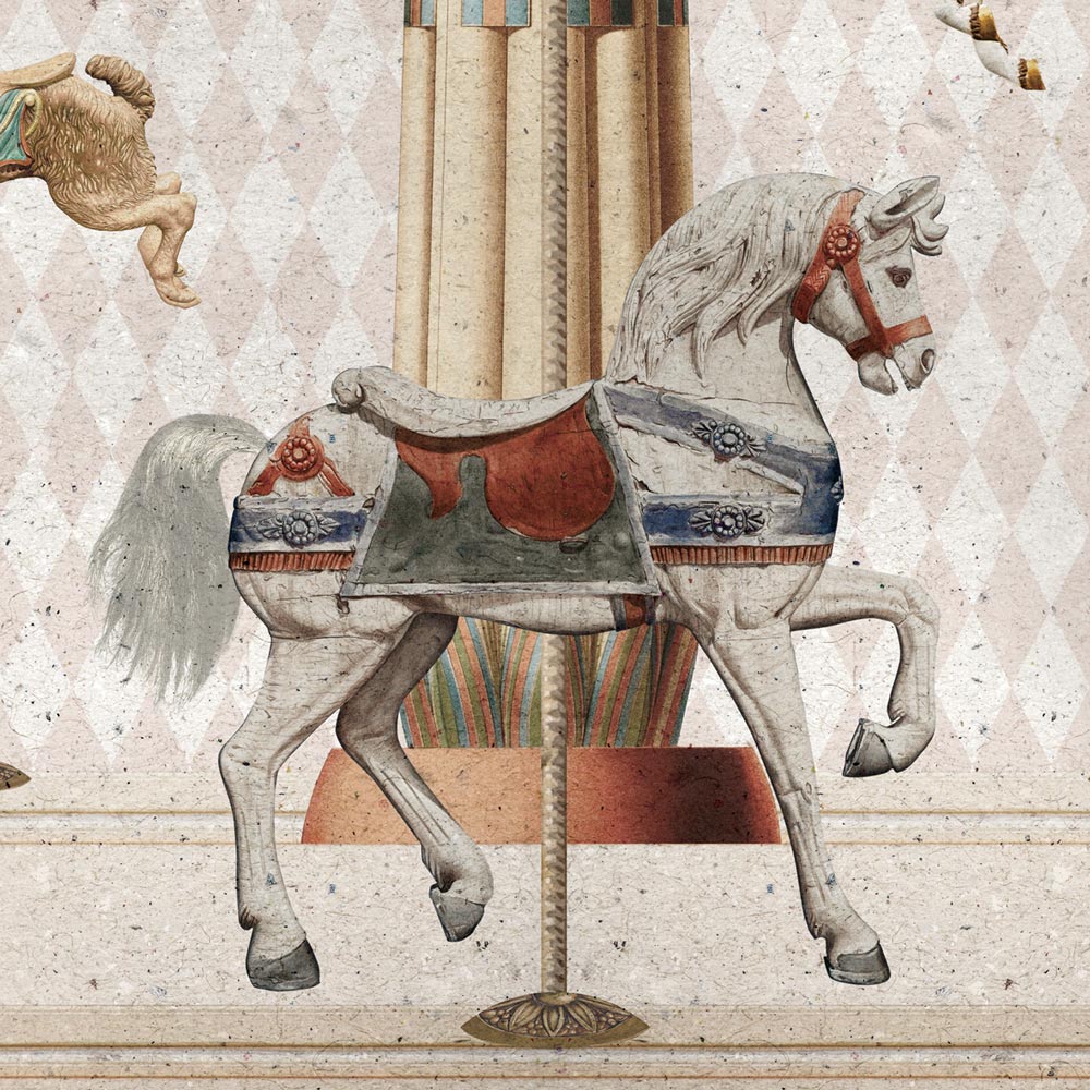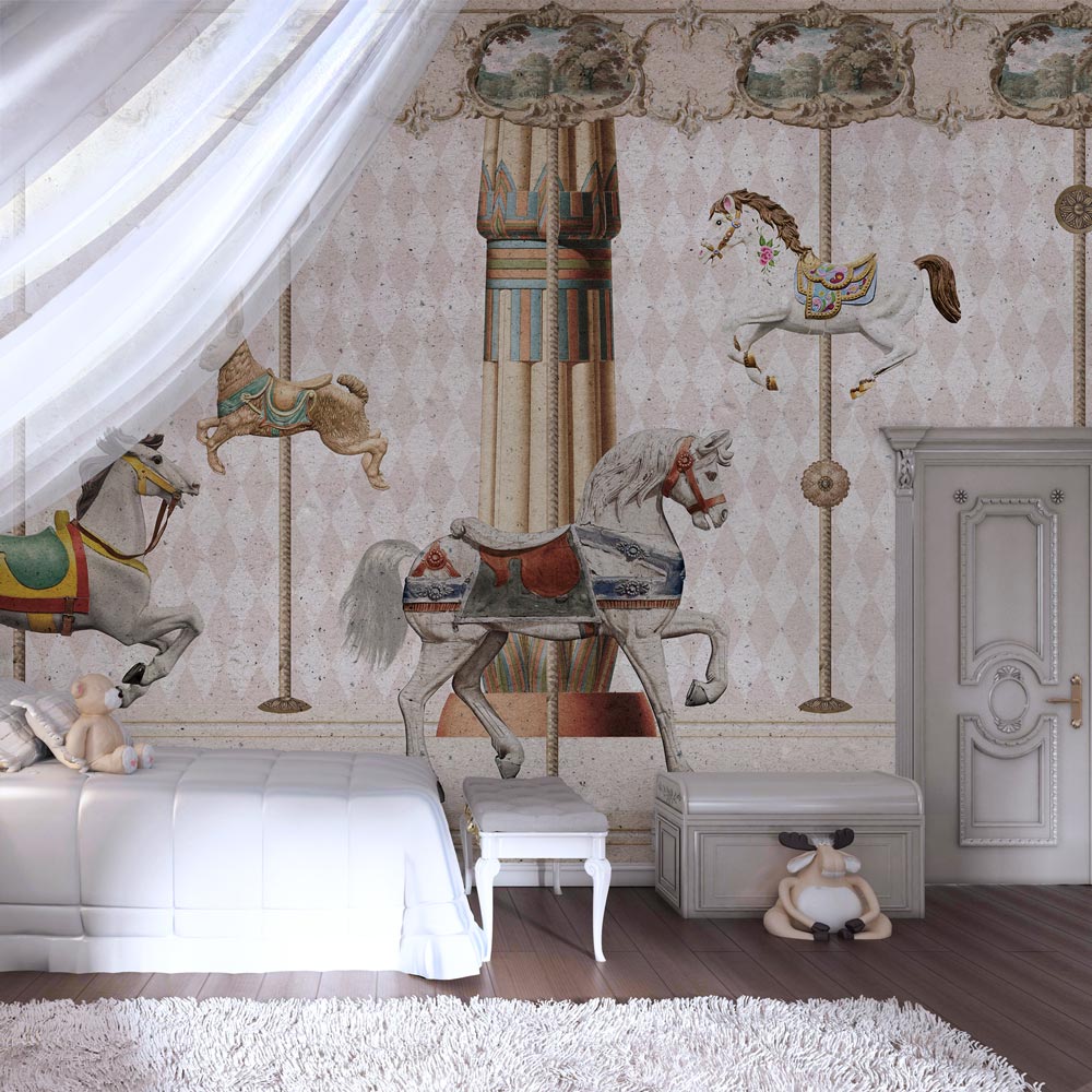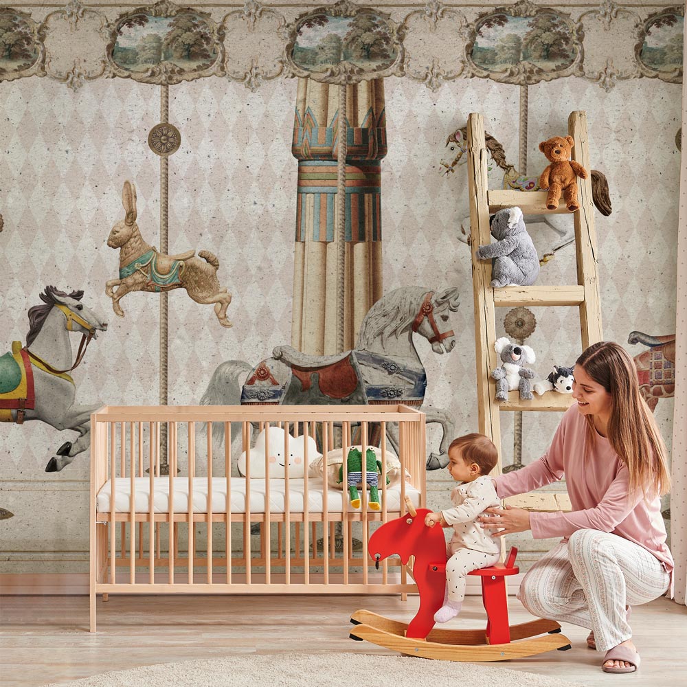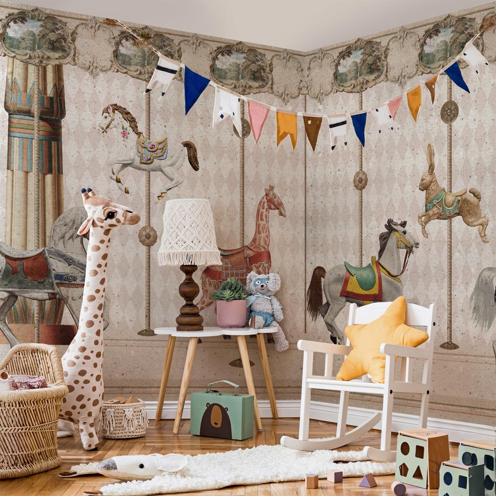 Lascia che la fantasia prenda il volo nella cameretta dei tuoi bambini con la carta da parati "Carosello magico". Questo design irresistibile, realizzato in un delicato stile vintage, trasforma le camerette dei più piccoli in un animato parco giochi.