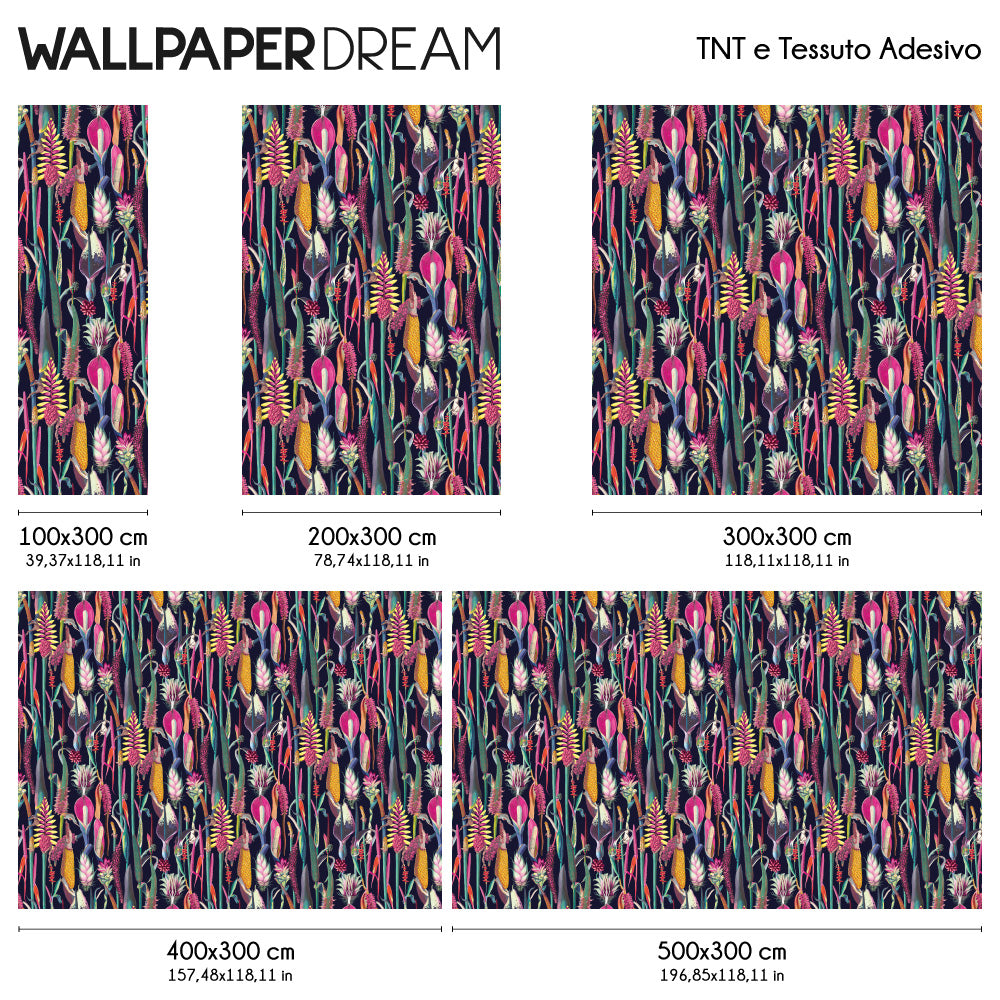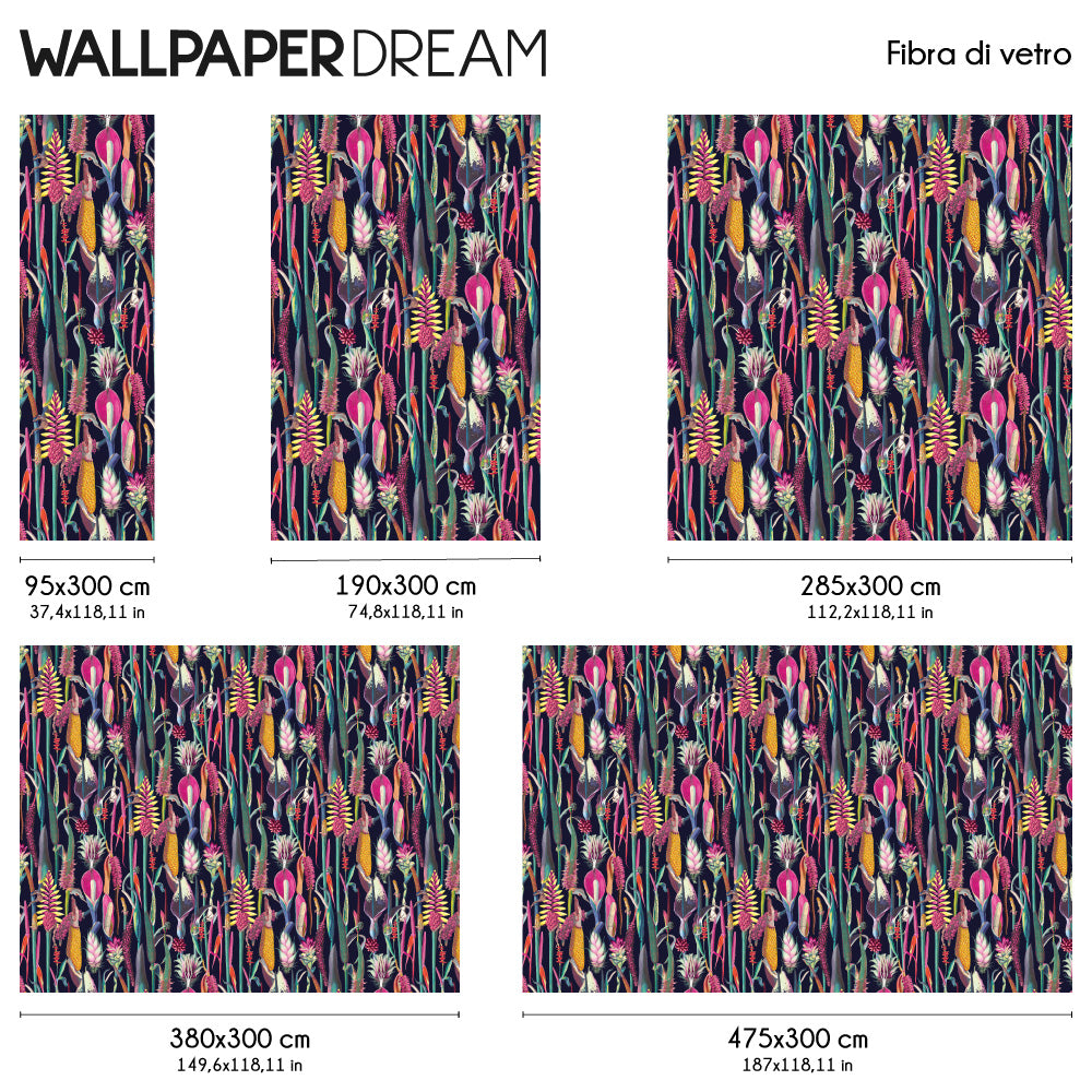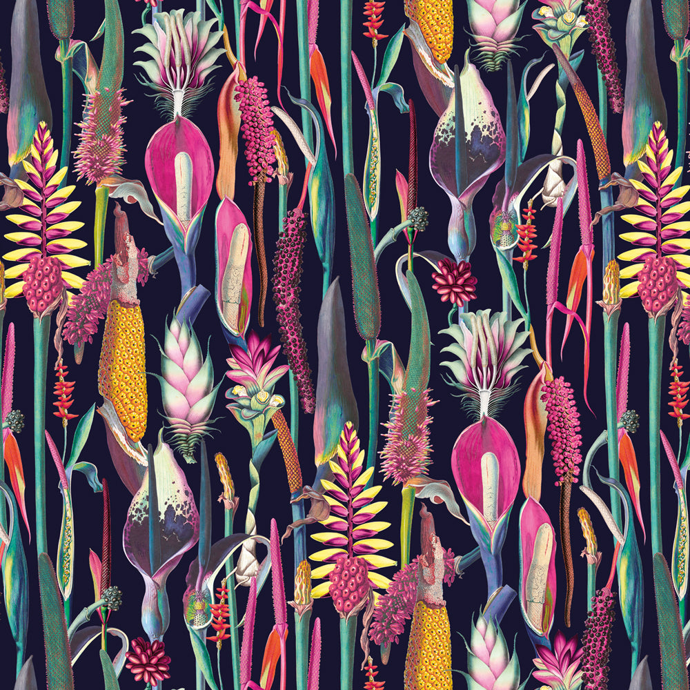 Viste las paredes de colores con el maravilloso Papel Pintado "Tropicale in rosa" donde diversas hojas y flores tropicales se entrelazan sobre un fondo azul noche. Los tonos brillantes y modernos hacen que este diseño sea único y reinterpretan en clave contemporánea las grabados botánicos vintage.