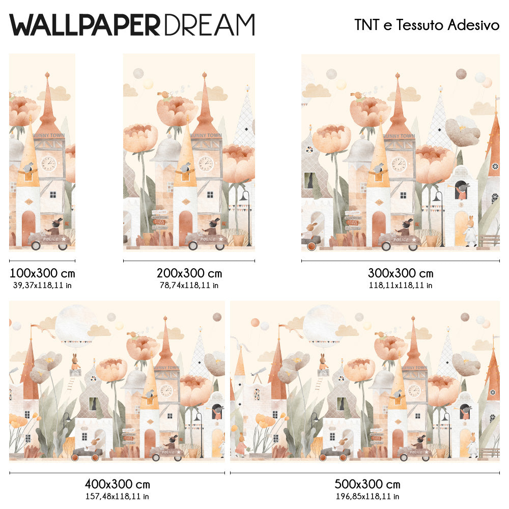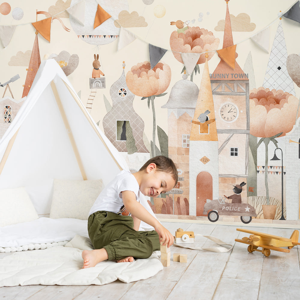 La Papel Pintado para niños "Bunny town" hará soñar a tus pequeños con la representación de una tierna ciudad llena de simpáticos conejitos antropomorfos. Los colores pastel en tonos naranja, gris beige y rosa calientan la habitación de los más pequeños sin sobrecargarla.