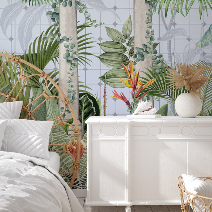 Bienvenida a la "invernadero tropical", donde la exuberante belleza de las plantas tropicales se combina con la elegancia del diseño vintage. Este maravilloso Papel Pintado te transportará a un oasis exótico dentro de un invernadero encantado.