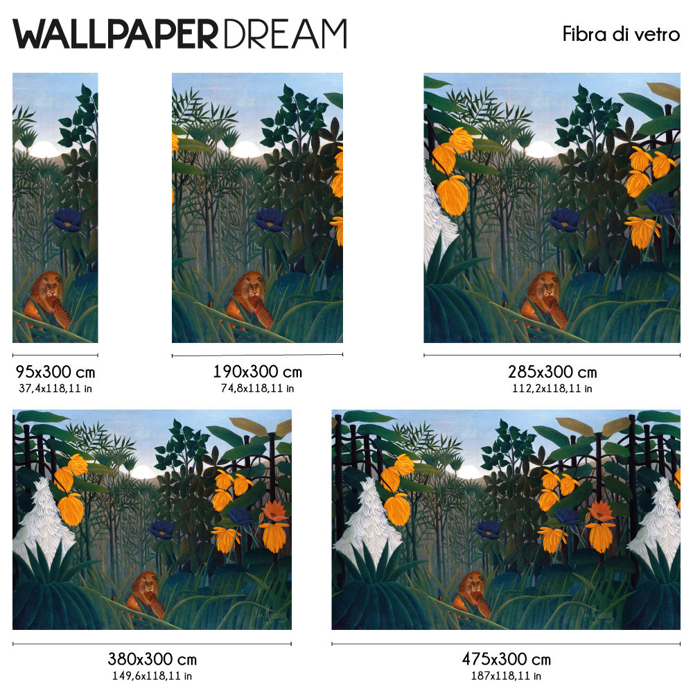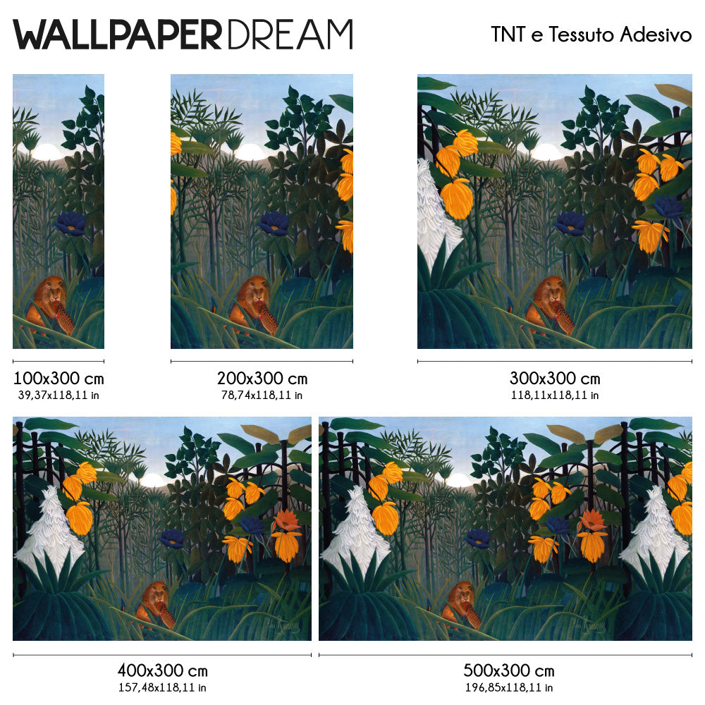 Allá Papel Pintado que representa la pintura "La comida del león" de Rosseau es una opción fascinante para transformar las paredes de tu hogar en una verdadera obra de arte. Esta pintura icónica del artista francés Enrique Rousseau, también conocido como "Le Rêve", captura la imaginación y el exotismo de la selva. Este diseño ofrece una visión aventurero Y misterioso de la selva, capturando la imaginación y creando un ambiente único y estimulante. Encaja perfectamente en estancias como salones, estudios o dormitorios.