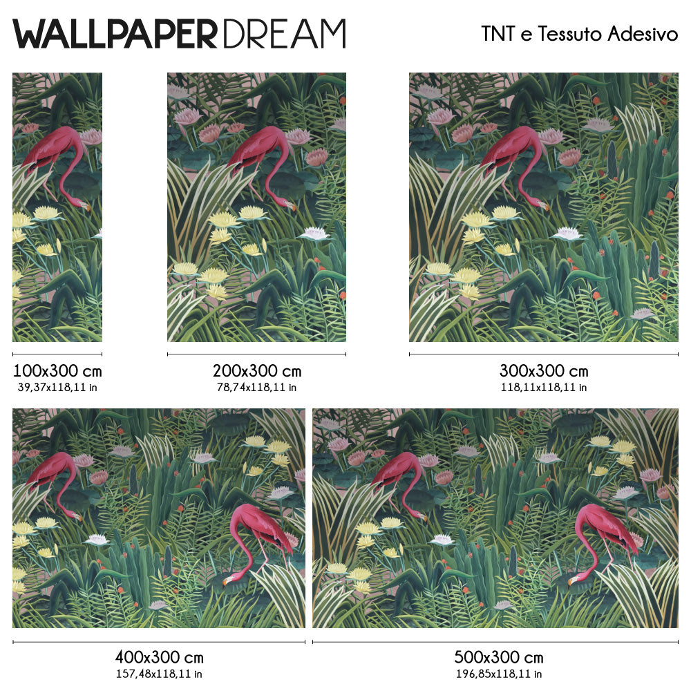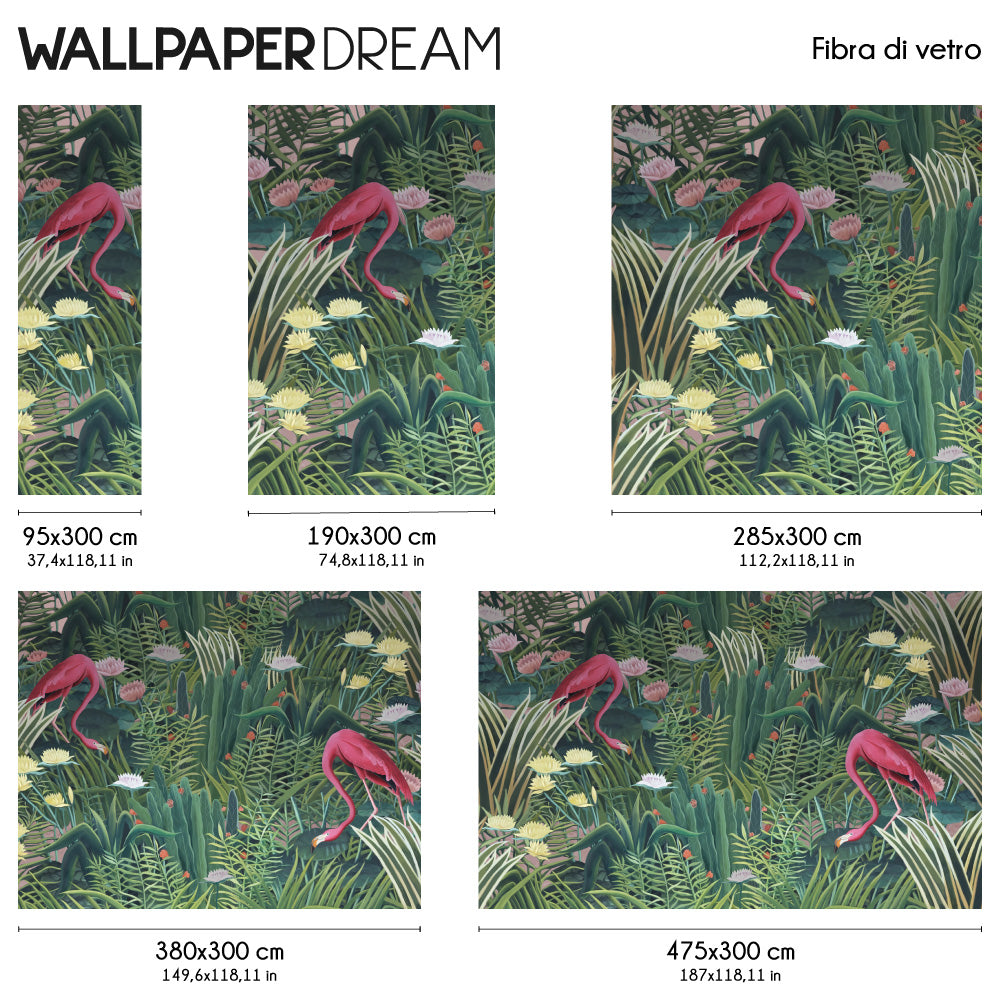 Viste tu casa de arte y belleza con el Papel Pintado "El Edén de Rousseau" inspirado en la producción pictórica del artista homónimo. Plantas tropicales en estilo naif se entrelazarán en tus paredes con sus mil matices de verde, mientras un solitario flamenco rosa calentará y hará único este paisaje idílico.