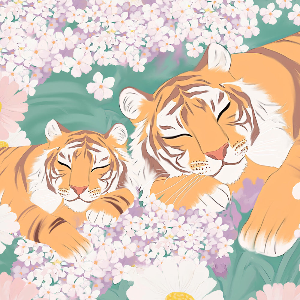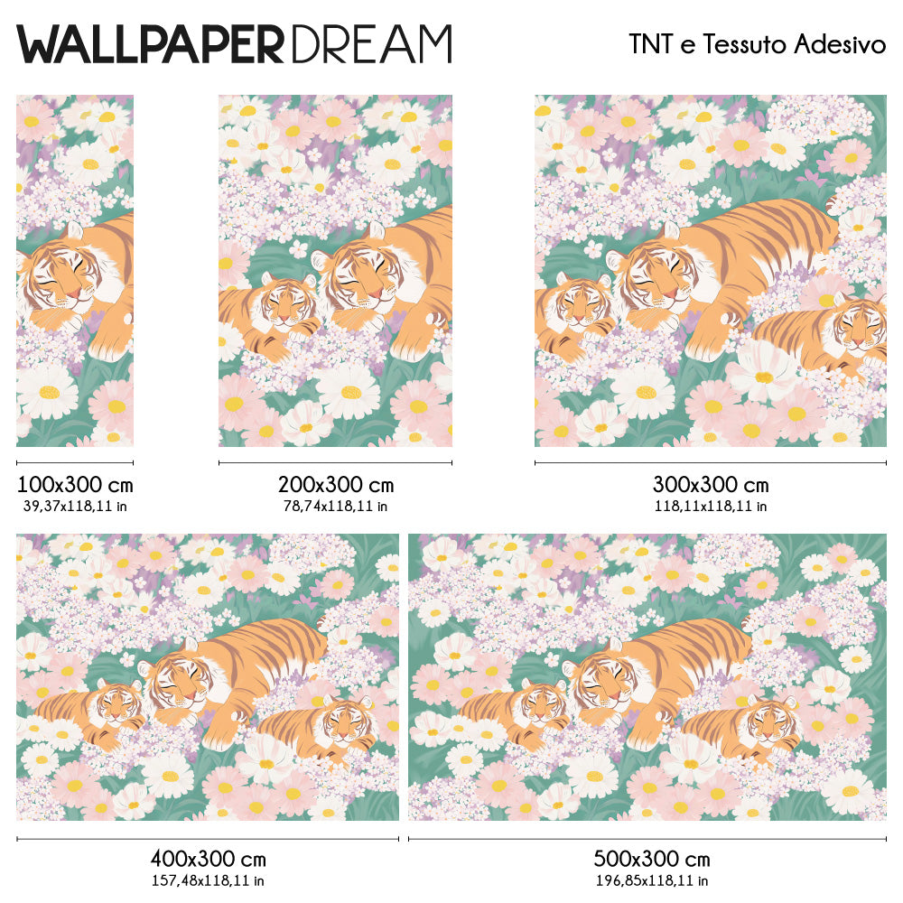 El Papel Pintado de colores delicados "Los tigres duermen esta noche" es ideal para revestir de dulzura las habitaciones de los más pequeños. Los tigrecitos dormitan en el prado adornado de margaritas y flores rosas y lilas. El trazo naif y pasteloso hacen que este papel sea original y delicadísimo, los trazos ejecutados rápidamente con pincel hacen que esta gráfica sea artística y suave, acompañando el sueño de los más pequeños.