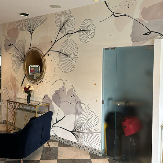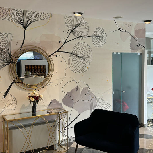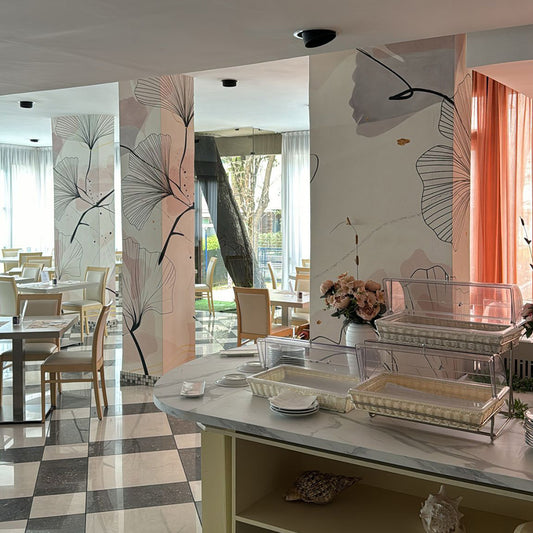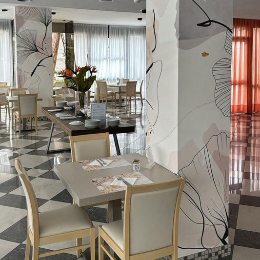 Les graphismes et les dimensions ont été méticuleusement adaptés à l'architecture de l'hôtel, en adaptant les panneaux et la graphie également pour le revêtement des colonnes. Notre philosophie repose sur une collaboration constante avec le client. Pour cette raison, le personnel de WallpaperDream envoie régulièrement des aperçus et des simulations du Papier Peint, s'assurant que chaque détail corresponde à vos attentes.