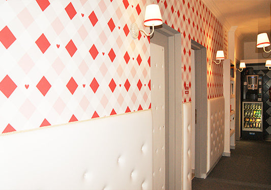 Les graphismes et les mesures ont été conçus selon les instructions du client et ont été adaptés à l'architecture unique de l'hôtel, créant une parfaite harmonie entre environnement et décoration.