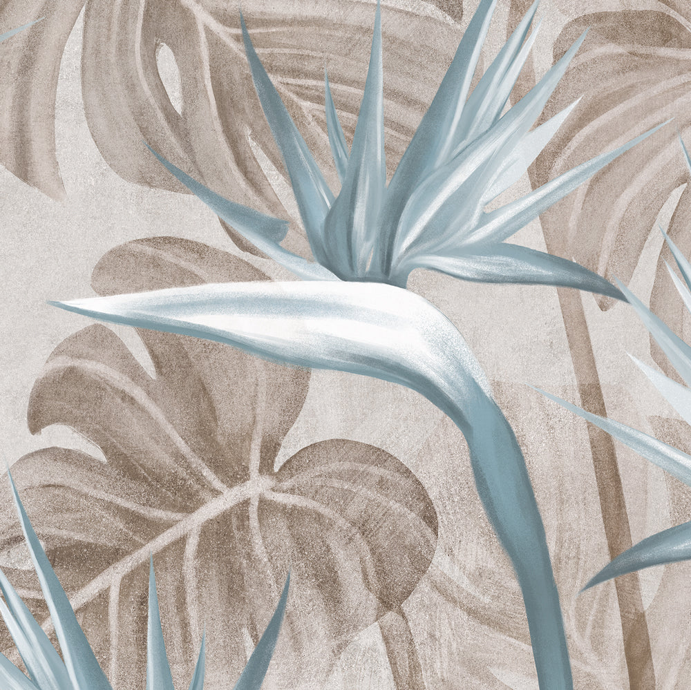 Au centre de cette composition, monstera et strelitzias s'entrelacent avec grâce, émergeant d'un fond effet béton sophistiqué. Les grandes feuilles, baignées de tons beiges délicats, flottent dans une atmosphère légère et aérée, créant une illusion fascinante de profondeur qui invite à perdre le regard et à rêver les yeux ouverts.
