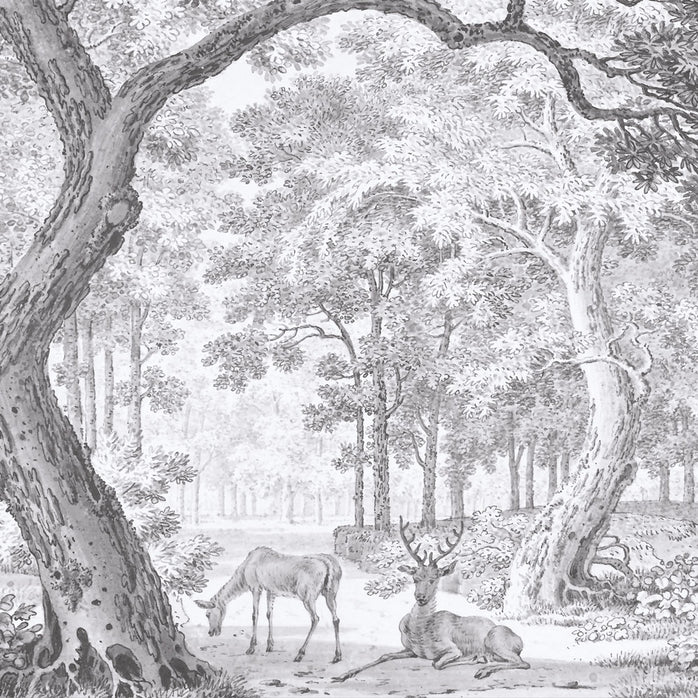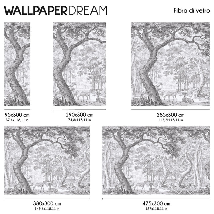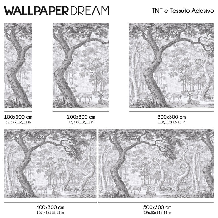 Realizzata con un ricercato effetto incisione in bianco e nero, questa grafica monocromatica gioca sui contrasti drammatici e sulla precisione del tratto. Alberi secolari si ergono maestosi, le loro chiome intricate creano un gioco di luci e ombre che dà profondità alla stanza. Al centro, in uno spiazzo inaspettato, due cervi si incontrano: guardiani silenziosi di un segreto millenario.