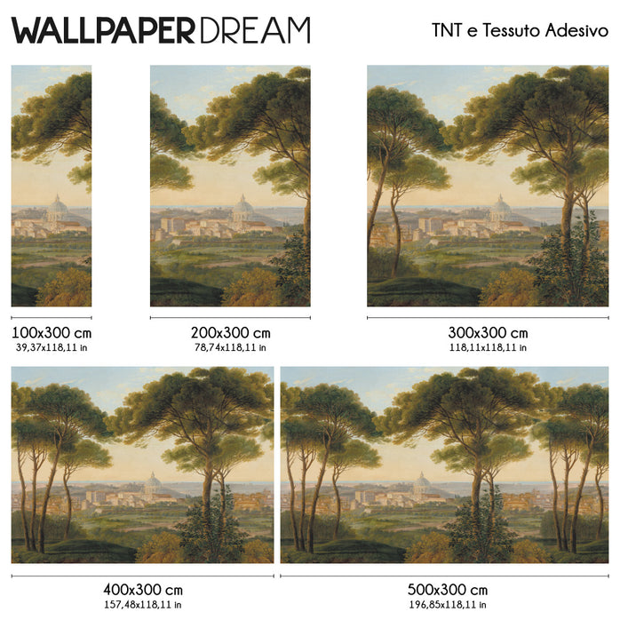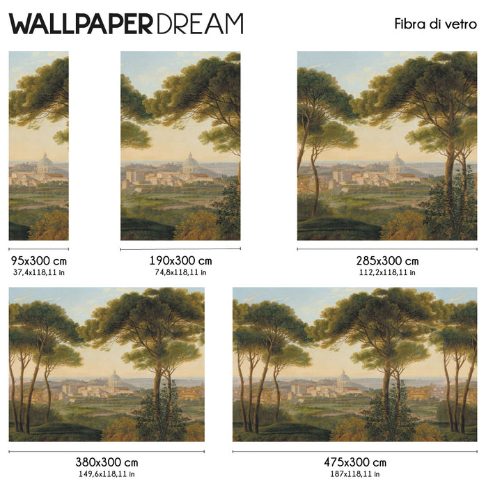 Contrairement aux vues modernes, ce design célèbre la Rome du XIXe siècle : un paysage où la majestueuse coupole du Vatican émerge de la végétation luxuriante. De grands pins parasols, des cyprès centenaires et des plantes grimpantes enveloppent la ville antique, créant un équilibre parfait entre architecture et nature.