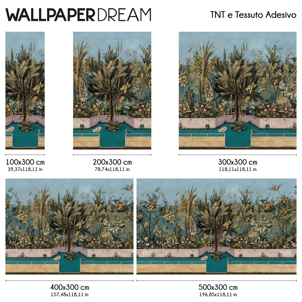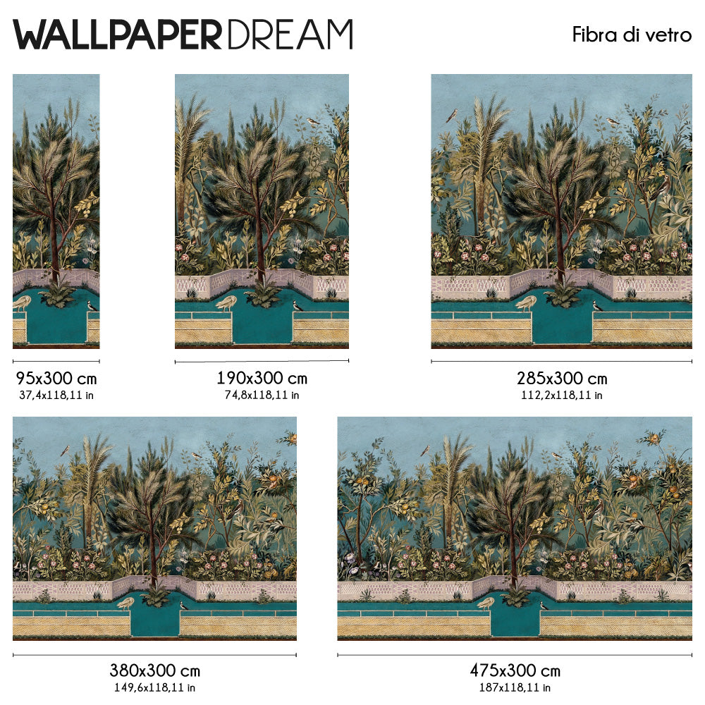 Il soggetto bucolico, animato da uccelli e floride piante, incanterà ogni tuo ospite, invitando lo sguardo a perdersi nell'infinito. Alberi secolari e fiori spuntano tra recinzioni in muratura e inferriate, un tocco architettonico che dona profondità alla scena e rende l'atmosfera ancora più magica.