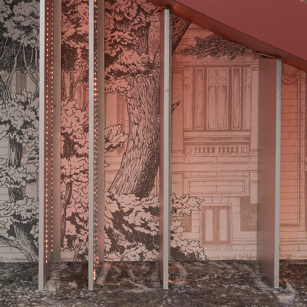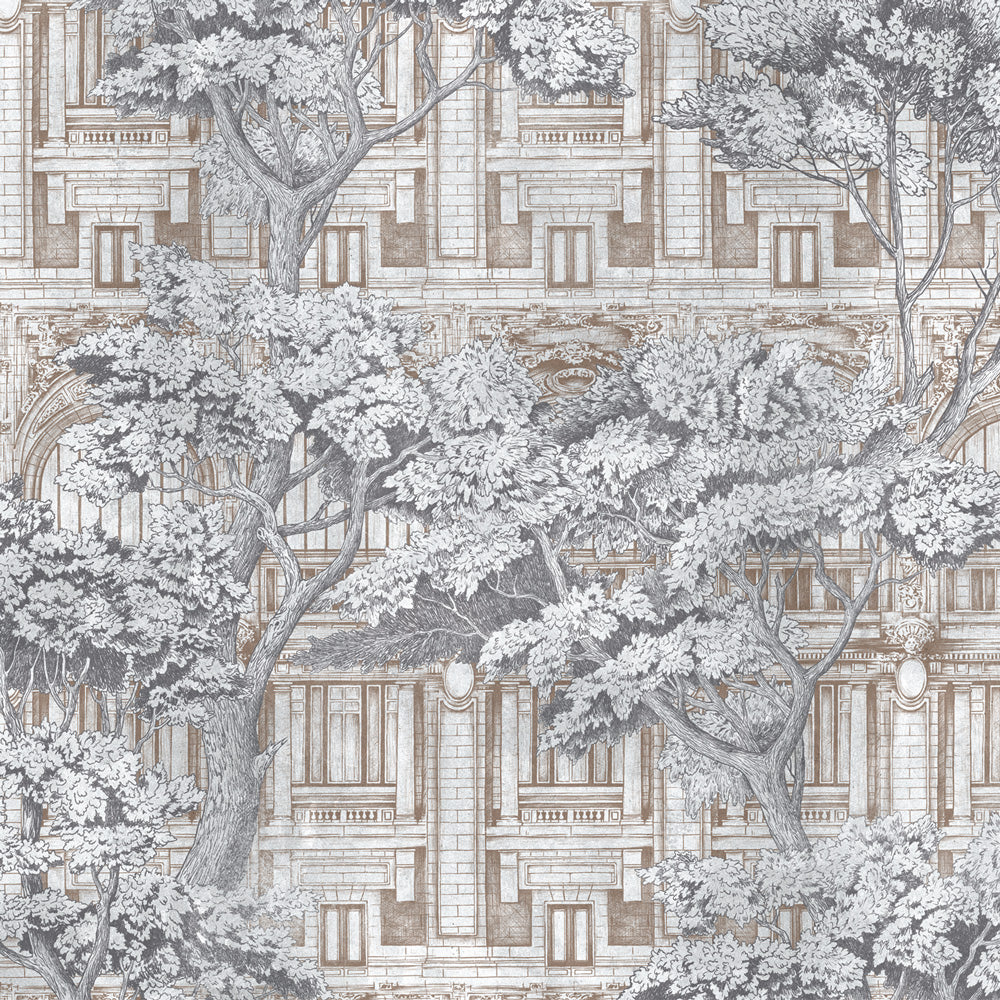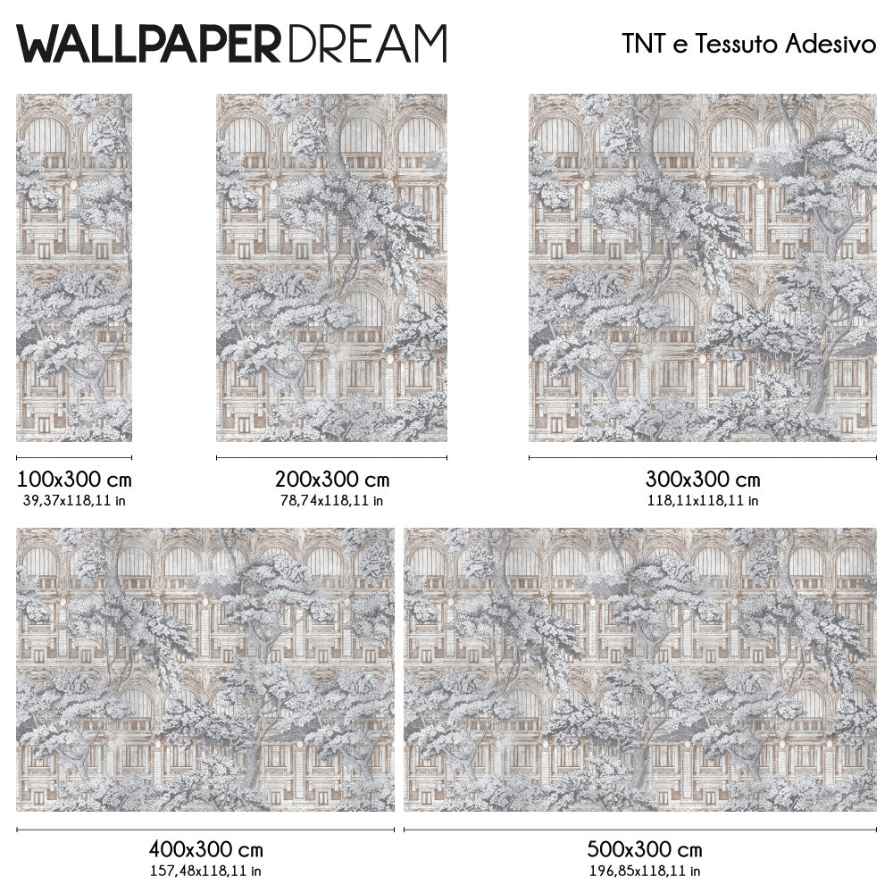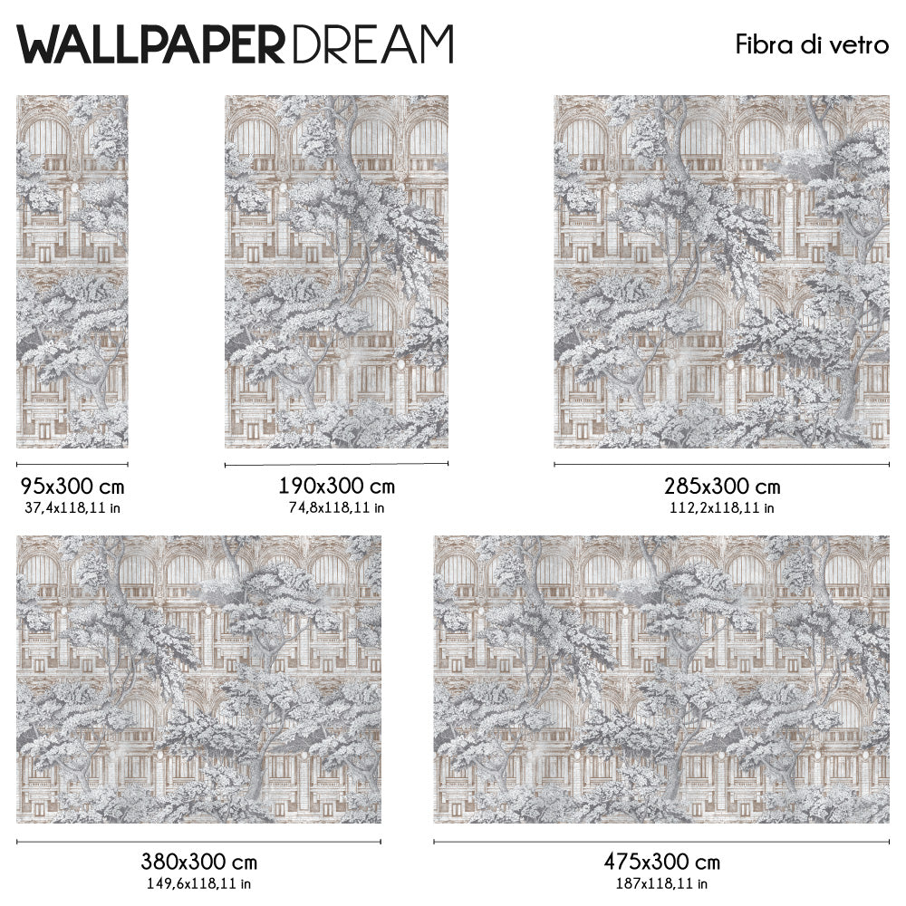 La carta da parati "Bosco Architettonico" raffigura, in delicato stile artistico gessoso, una facciata neoclassica incorniciata da alberi nodosi. Le piante si intrecciano surrealmente tra le arcate e i finestroni adorni di cornici, su un delicato muro rovinato che arricchisce ulteriormente la grafica.