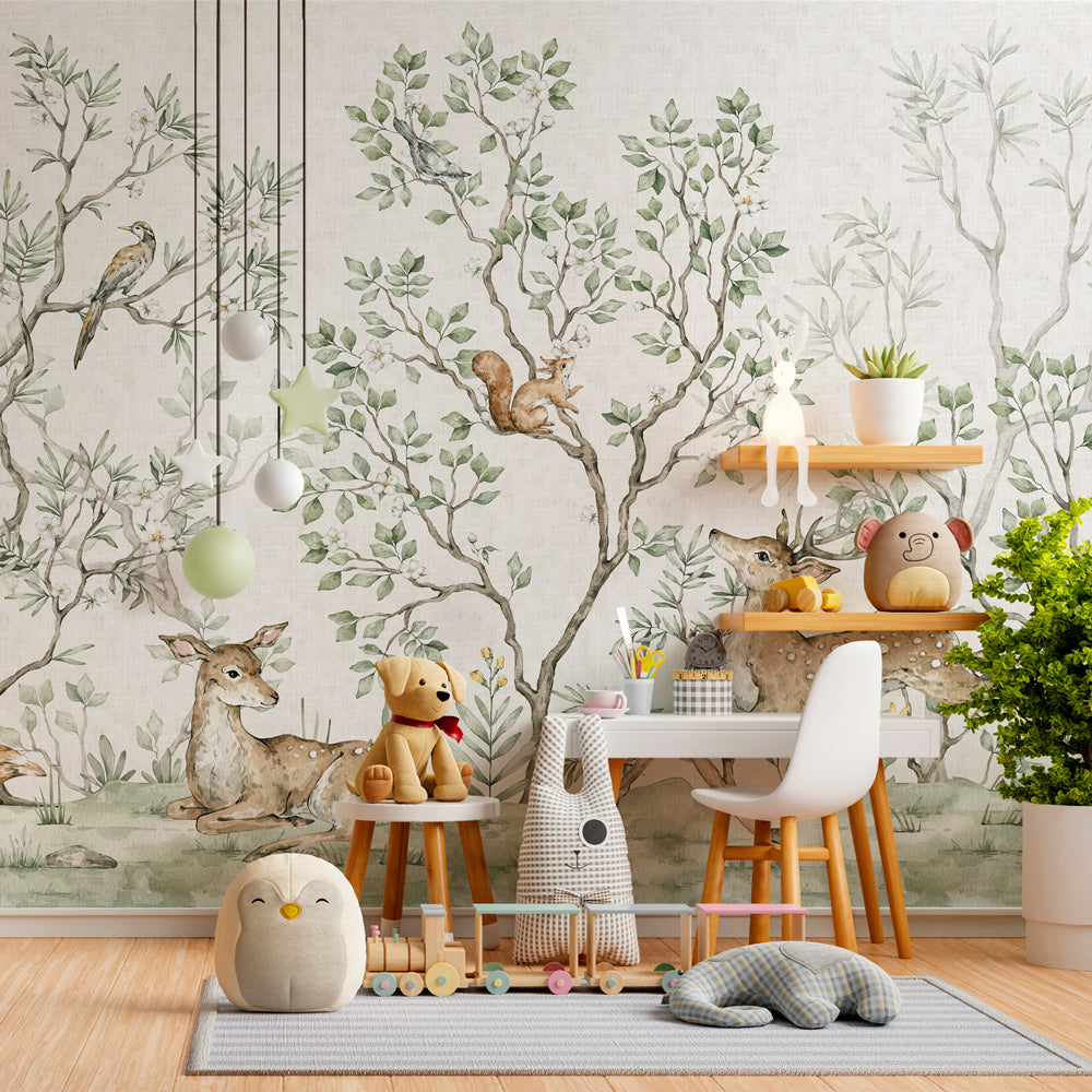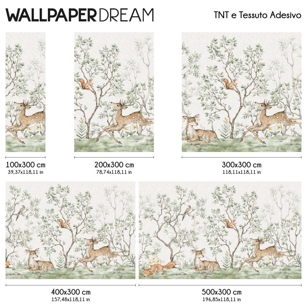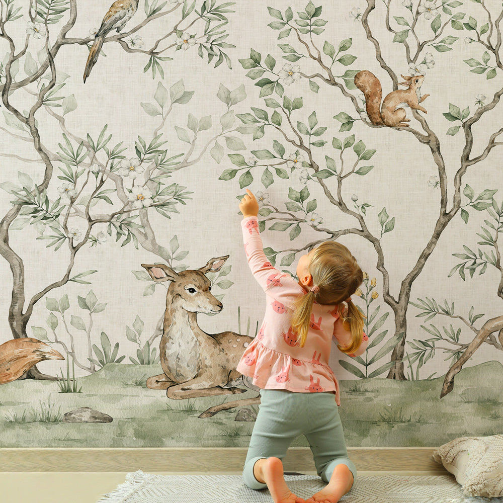 Accendi la fantasia dei più piccoli e trasforma la loro stanza in un luogo magico con la carta da parati "Bosco incantato". In questo scenario fiabesco tracciato con la delicatezza dell'acquerello, simpatici animaletti della foresta fanno capolino tra alberi e fiori, pronti a diventare i compagni di gioco ideali in un mondo di allegria e scoperte.