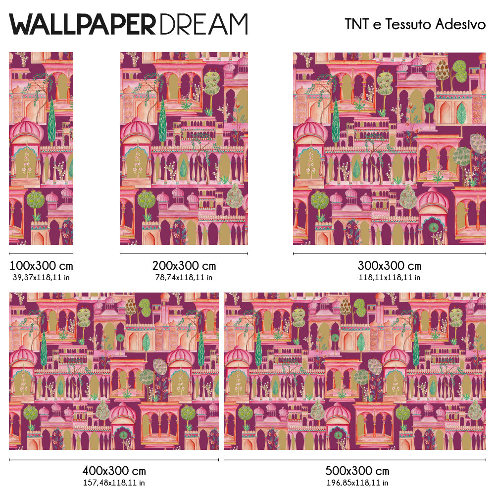 La carta da parati artistica "Città d'Oriente" raffigura, con tonalità sgargianti, antichi palazzi dal sapore indiano. Archi, cupole e colonne incorniceranno le tue pareti insieme alle piante e ai fiori stilizzati. I toni del rosa e dei fucsia renderanno ogni ambiente unico nel suo genere. Disponibile in due colorazioni di fondo: amaranto e beige.