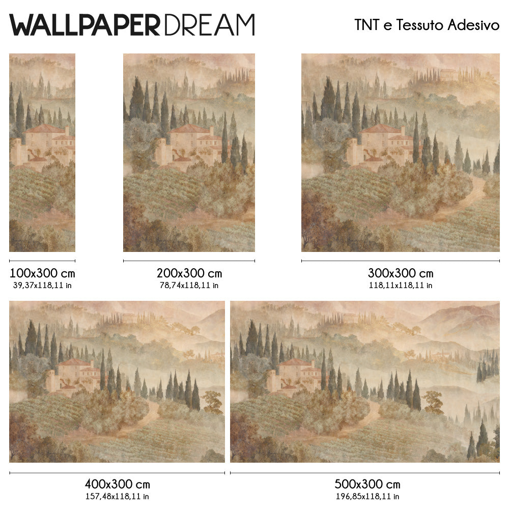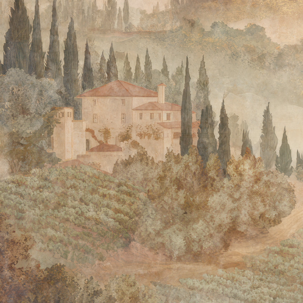 La particolarità di questo rivestimento risiede nel suo delicato effetto acquerello anticato: una finitura che dona profondità e un sapore "vissuto" di rara bellezza. I cipressi maestosi e le dimore di charme si stagliano su una vegetazione densa, trasformando ogni stanza in una finestra aperta sulle colline più famose del mondo.