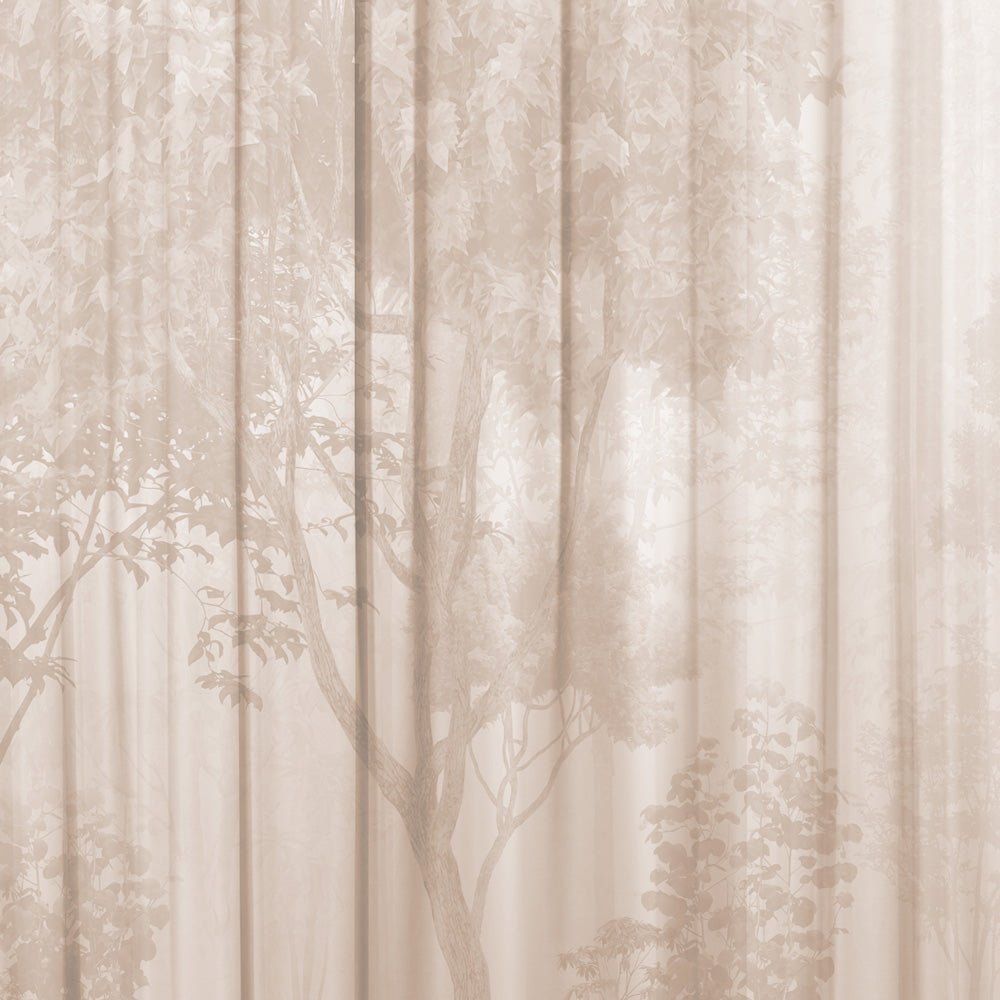 Esplora la bellezza incantevole della "Finestra sul giardino", una carta da parati delicata che cattura l'essenza e la magia di una foresta color crema appena nascosta dalla coltre di una tenda semitrasparente.