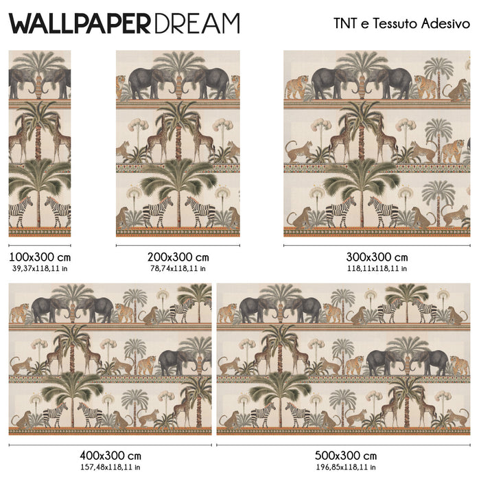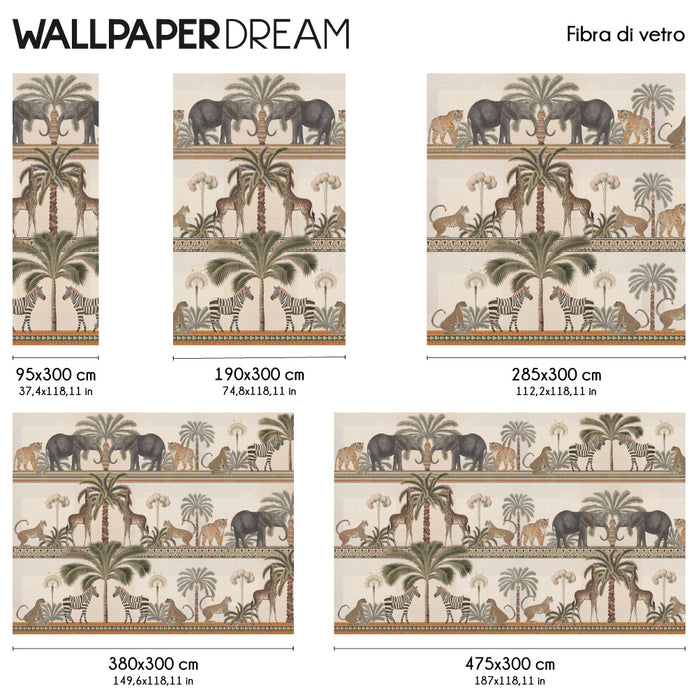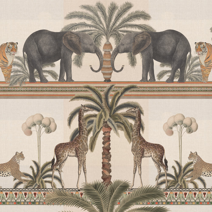 Lasciati trasportare in un viaggio esotico con la carta da parati vintage "Fregio Esotico", un'opera che si ispira all'arte decorativa antica. In questo design sinuoso ed elegante, tigri tibetane, giraffe, zebre e altri animali esotici prendono vita, affiancati da palme e piante dal tratto naif.