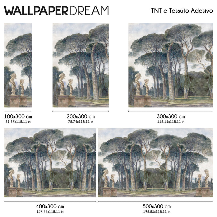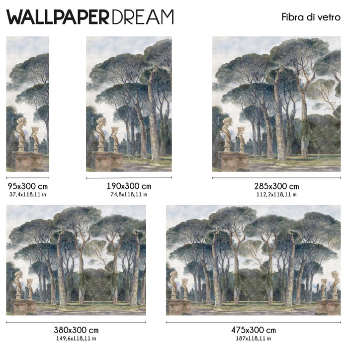 La carta da parati "Gianicolo" raffigura, in un raffinato stile acquerello, un paesaggio di chiara ispirazione romana. Statue antiche incorniciano un arboreto ricco di pini marittimi, il sole disegna sul prato florido ombre e luci dorate, che contribuiscono a dare profondità all'ambiente. Scegli questo design dal fascino vintage per decorare i tuoi ambienti, dalle camere da letto ai corridoi, bagni, box doccia o soggiorni.