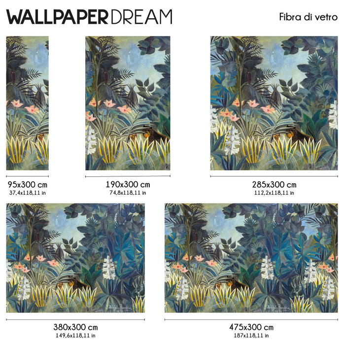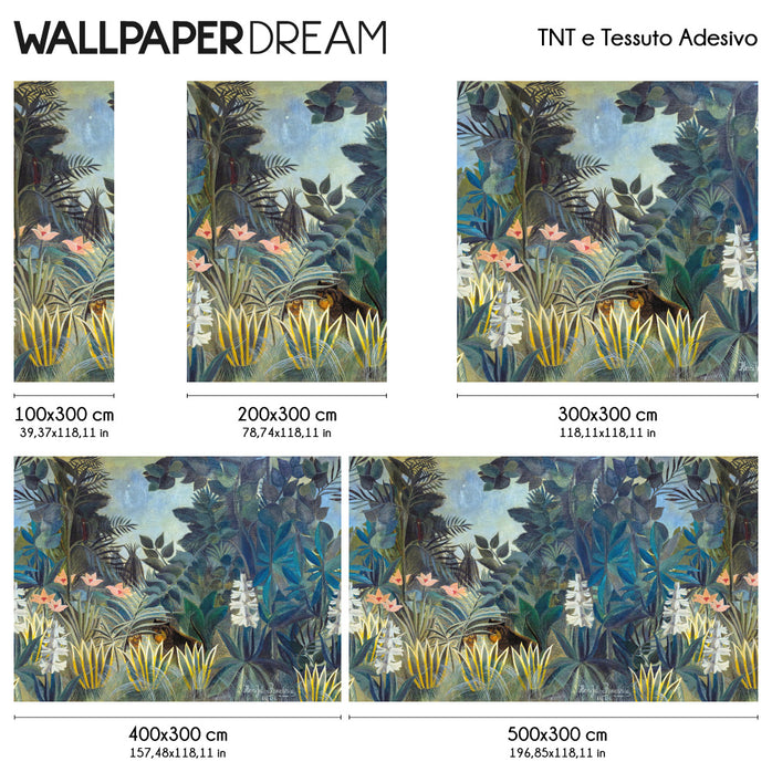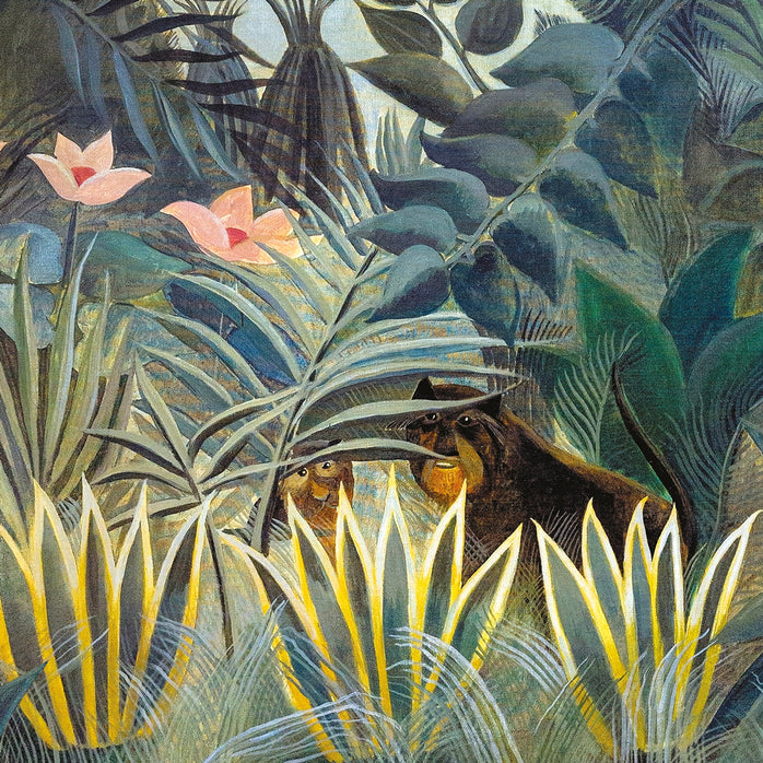 I tratti pittorici di Rousseau danno vita alle piante e ai fiori di "Giungla equatoriale" , creando un'atmosfera incantevole e suggestiva tipica della pittura naif. Ogni dettaglio è dipinto con verdi vibranti che si fondono con le sfumature petrolio, creando un effetto di profondità e mistero.