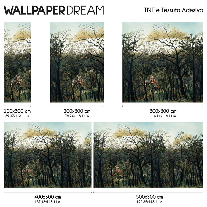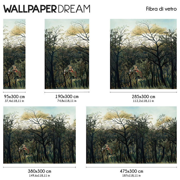 Lasciati sedurre da un'opera d'arte senza tempo: la carta da parati d'autore "Passeggiata nel Bosco". Questo capolavoro dell'artista Naïf Rousseau trasforma ogni parete in un'emozione pura.