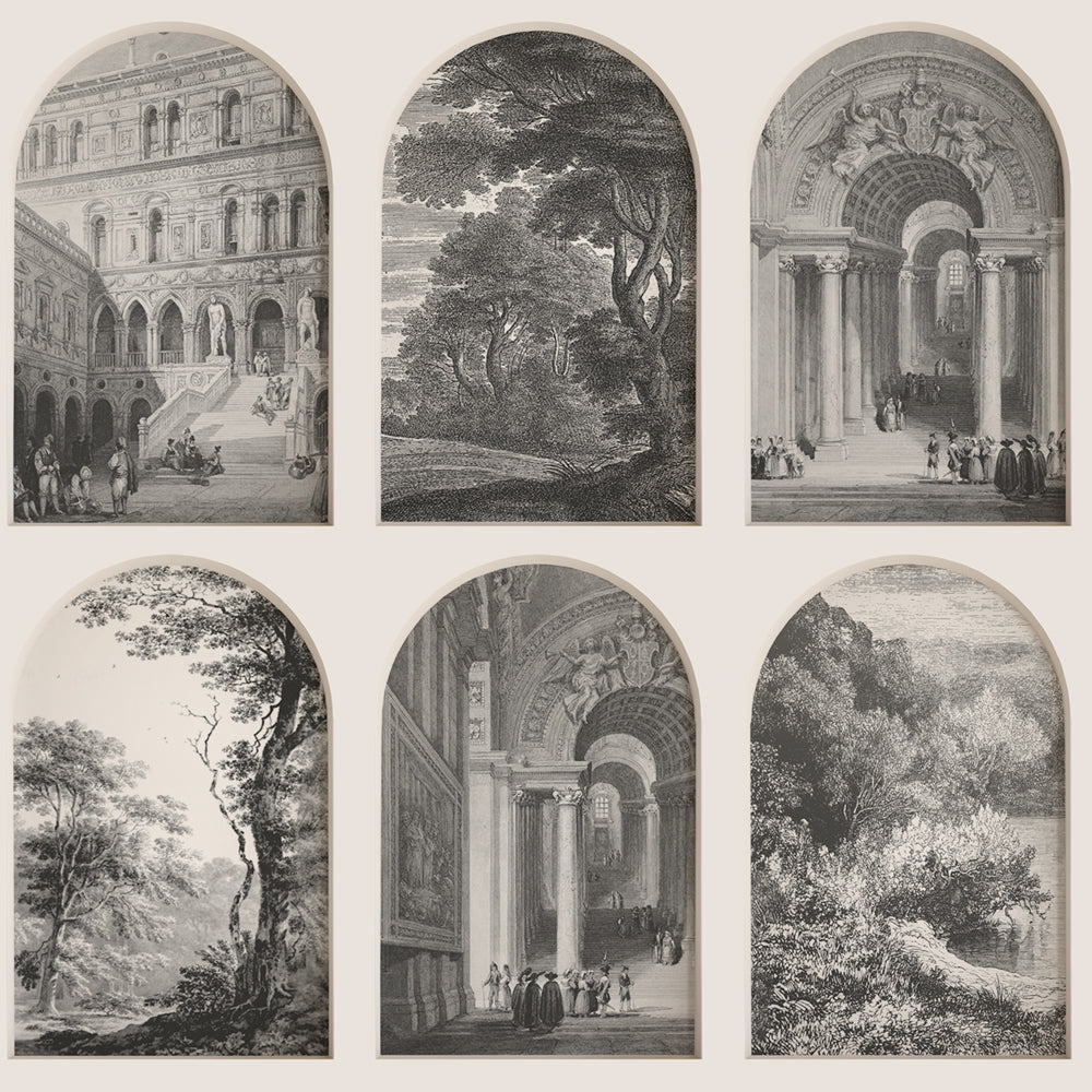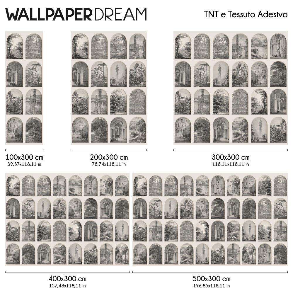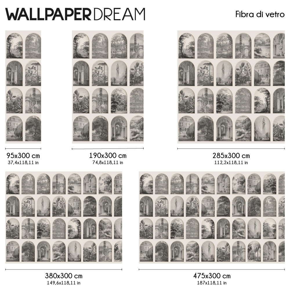 La carta da parati vintage "Pinacoteca" è un'affaccio su mille mondi diversi, da paesaggi bucolici e incontaminati a città antiche. Lo stile incisione rende questa grafica ideale per ambienti dal sapore vintage o per stanze a cui si voglia donare un sapore classico. Disponibile nella colorazione in bianco panna e nero.